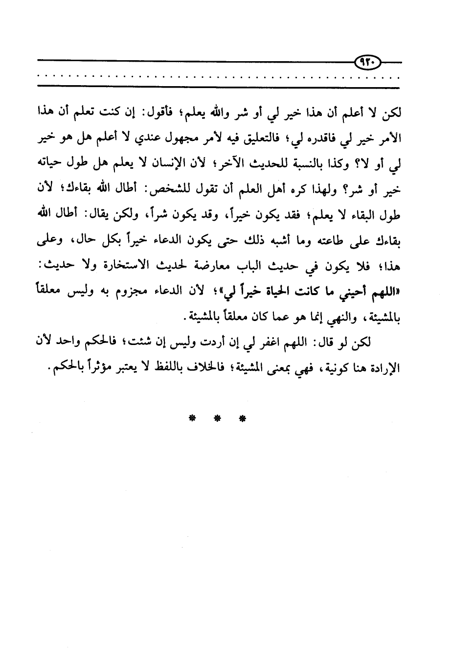 لكن لا أعلم أن هذا الخير لي أو شر والله يعلم، فأقول إن كنت تعلم أن هذا الأمر خير فاقدره لي، فالتعليق عندي مجهول لا أعلم هل هو خير لي أو لا؟ وكذا بالنسبة للحديث الآخر؛ لأن الإنسان لا يعلم هل طول حياته خير أو شر؟ ولهذا كره أهل العلم أن تقول للشخص: أطال الله بقاءك؛ لأن طول البقاء لا يعلم، فقد يكون خيرا، وقد يكون شرا، ولكن يقال: أطال الله بقاءك على طاعته وما أشبه ذلك حتى يكون الدعاء خيرا بكل حال، وعلى هذا، فلا يكون في حديث الباب معارضة لحديث الاستخارة ولا حديث: «اللهم أحيني ما كانت الحياة خيرا لي» ؛ لأن الدعاء مجزوم به وليس معلقا بالمشيئة، والنهي إنما هو عما كان معلقا بالمشيئة.