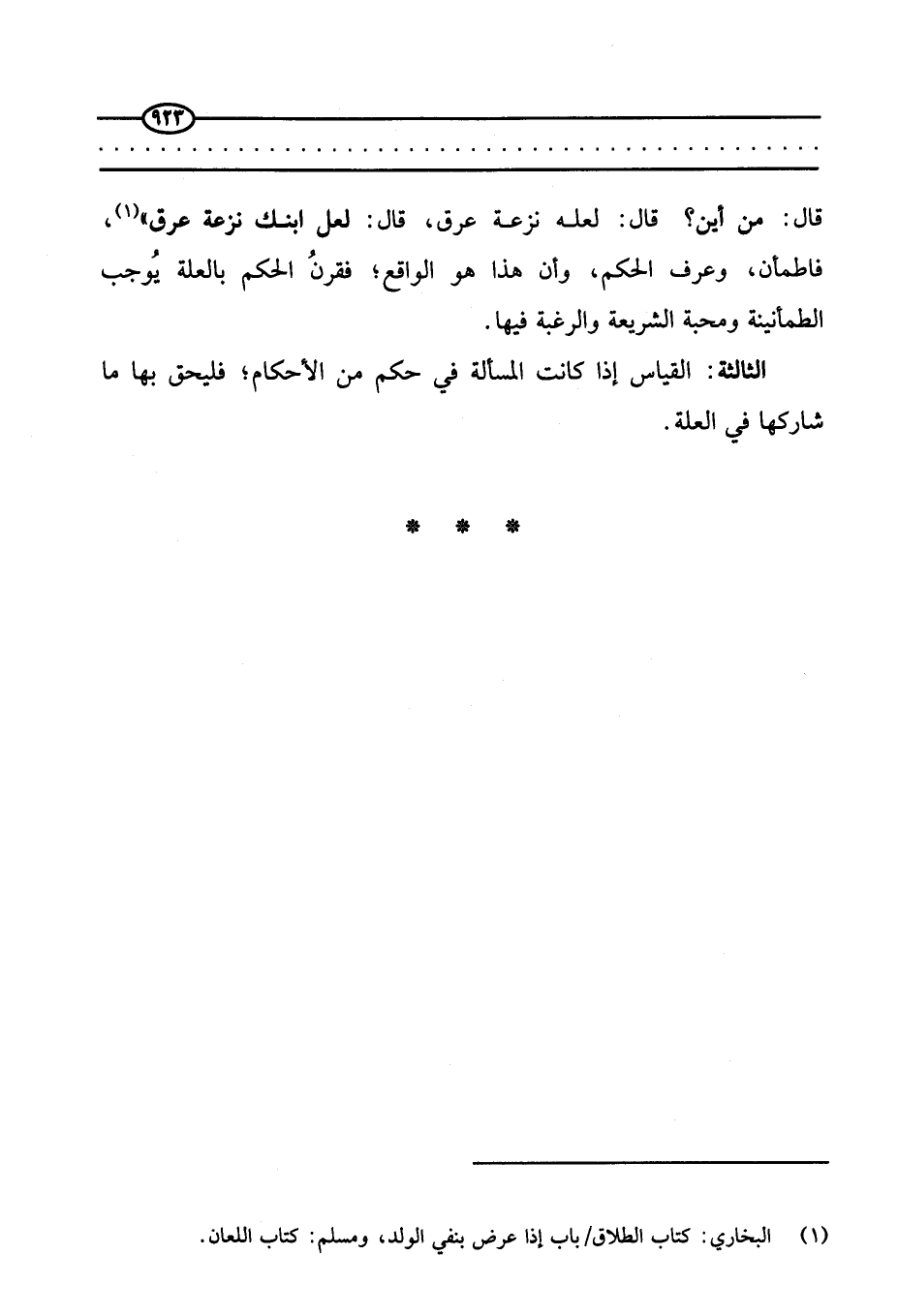 «قال: من أين؟ قال: لعله نزعة عرق» ، قال لعل ابنك نزعة عرق، فاطمأن، وعرف الحكم، وأن هذا هو الواقع، فقرنُ الحكم بالعلة يُوجب الطمأنينة ومحبة الشريعة والرغبة فيها.