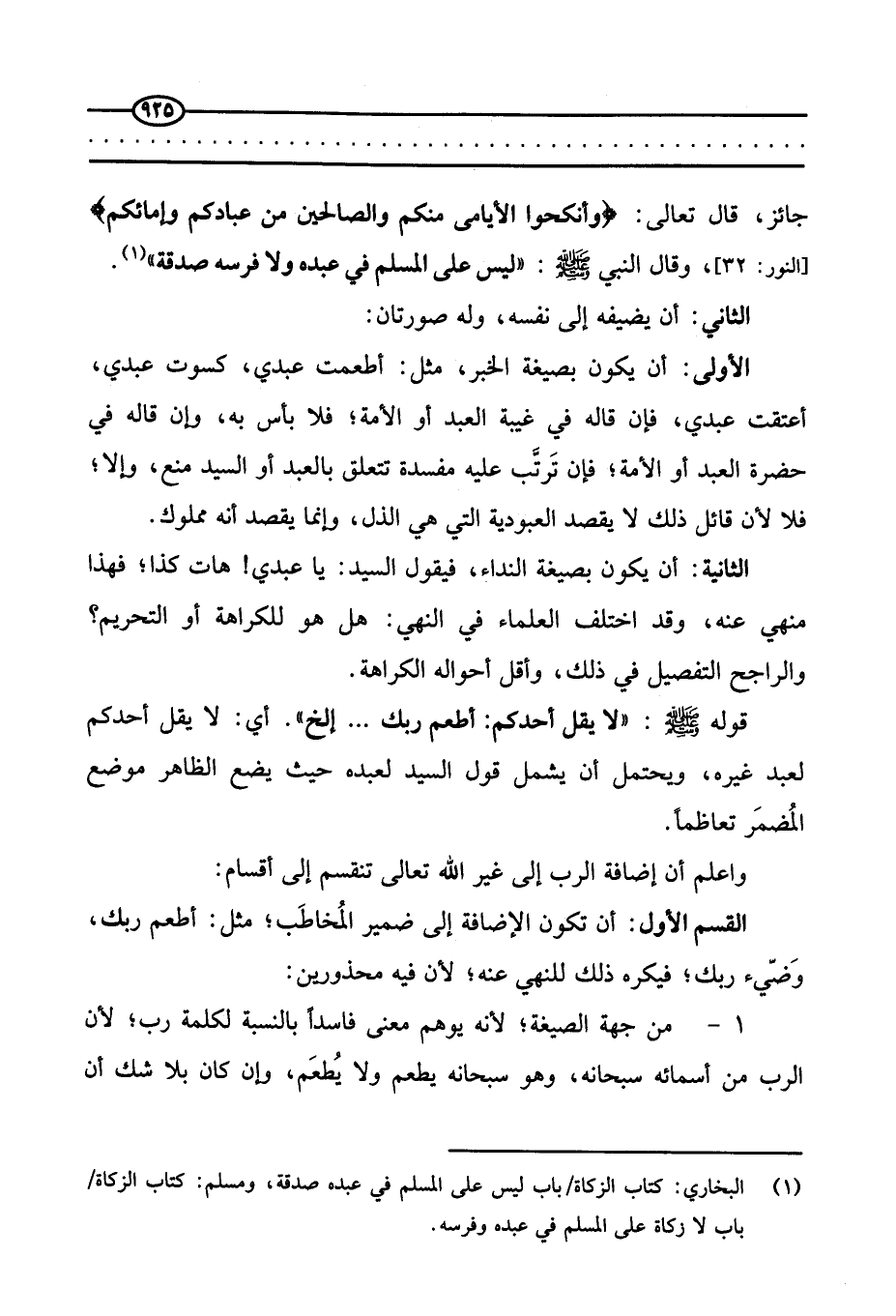 الأولى: أن يكون بصيغة الخبر، مثل: أطعمت عبدي، كسوت عبدي، أعتقت عبدي، فإن قاله في غيبة العبد أو الأمة، فلا بأس به، وإن قاله في حضرة العبد أو الأمة، فإن ترتب عليه مفسدة تتعلق بالعبد أو السيد منع، وإلا، فلا لأن قائل ذلك لا يقصد العبودية التي هي الذل، وإنما يقصد أنه مملوك.