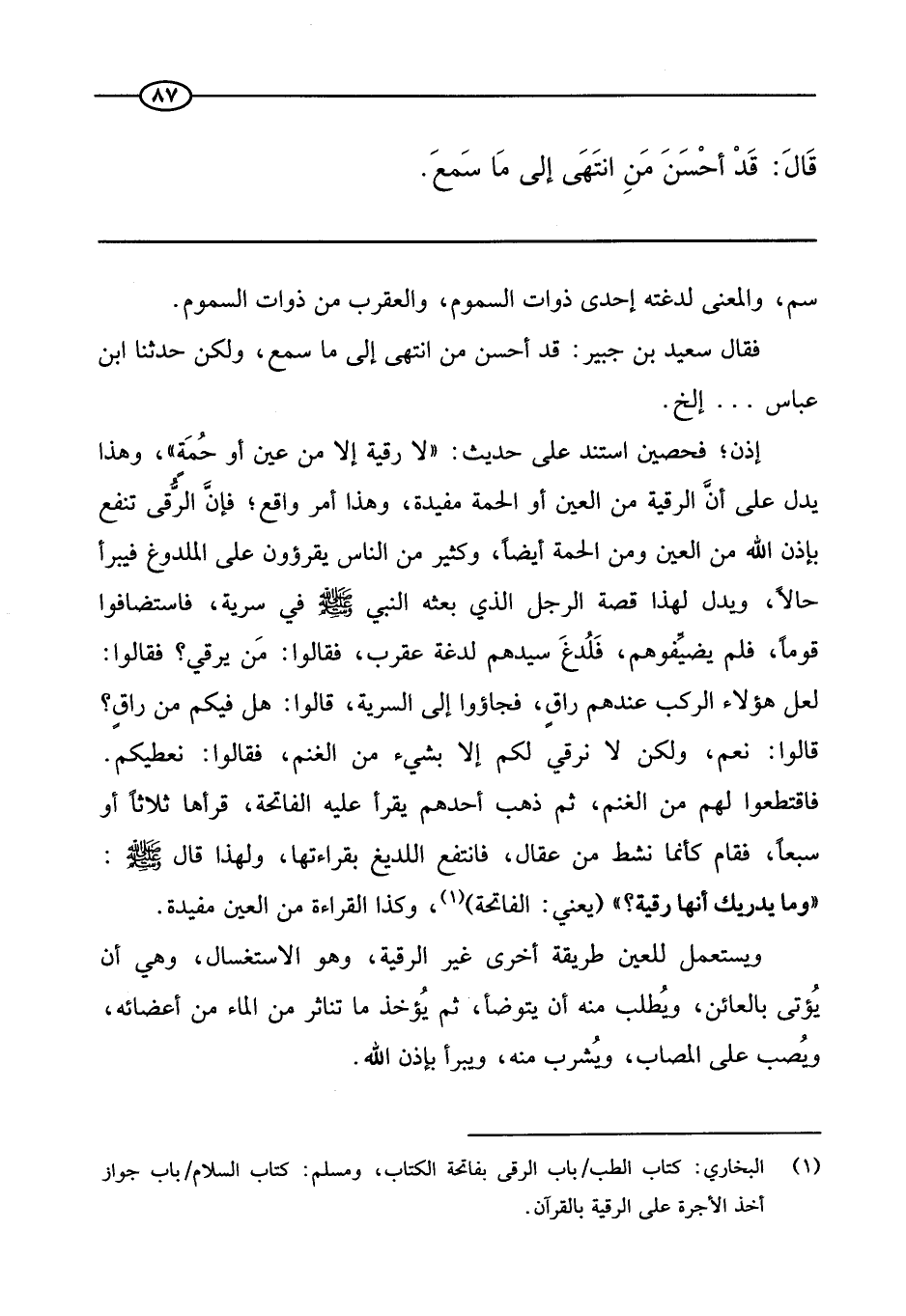 ولو قال قائل بالاقتصار على ما في هذا الحديث، وهو أنهم لا يسترقون ولا يكتوون ولا يتطيرون، وأن ما عدا ذلك لا يمنع من دخول الجنة بلا حساب ولا عذاب؛ للنصوص الواردة بالأمر بالتداوي والثناء على بعض الأدوية؛ كالعسل والحبة السوداء؛ لكان له وجه.