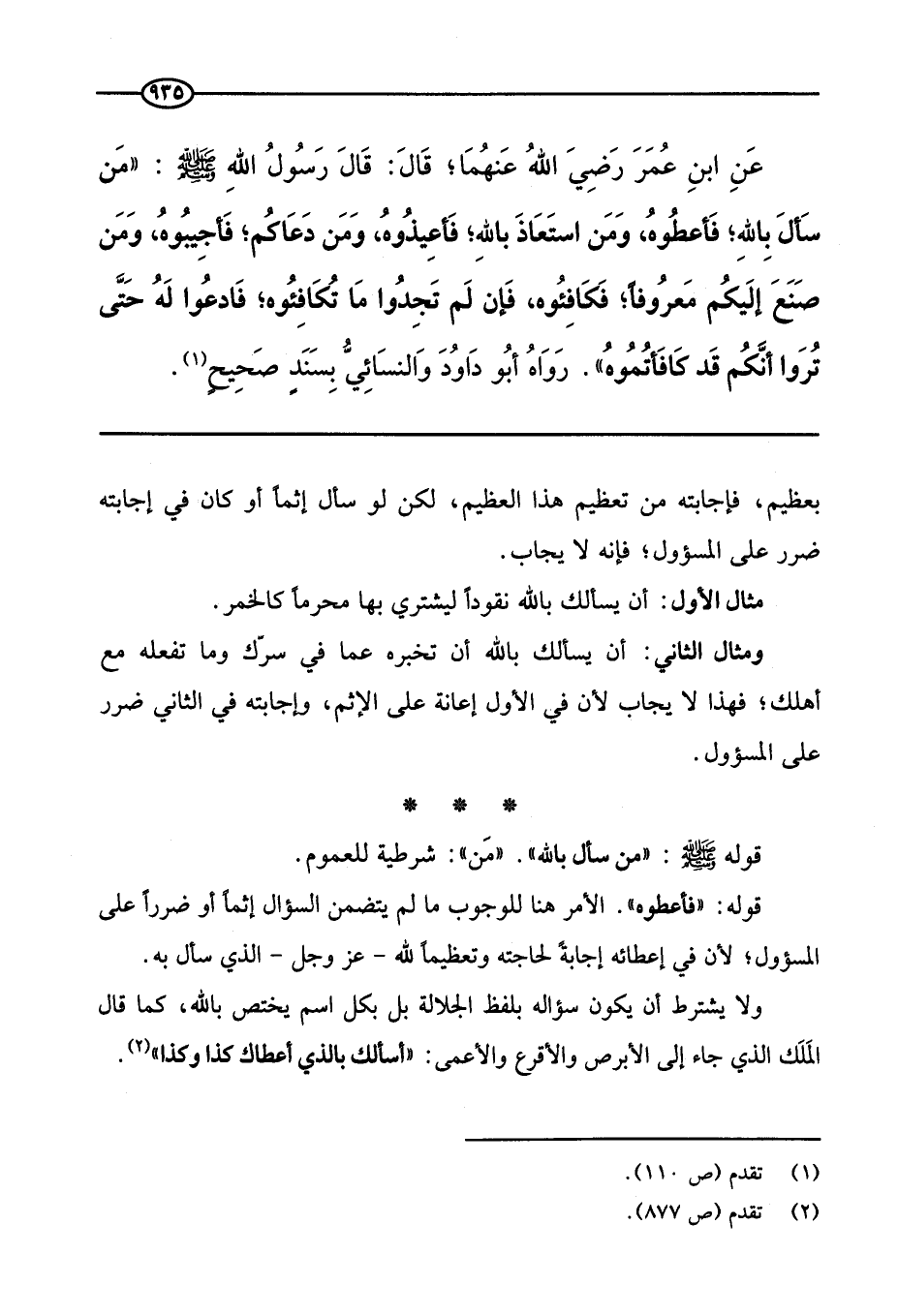 عن ابن عمر - رضي الله عنهما - قال: قال رسول الله - صَلَّى اللَّهُ عَلَيْهِ وَسَلَّمَ -: «من سأل بالله فأعطوه؛ ومن استعاذ بالله؛ فأعيذوه، ومن دعاكم؛ فأجيبوه، ومن صنع إليكم معروفا؛ فكافئوه، فإن لم تجدوا ما تكافئوه، فادعوا له حتى تروا أنكم قد كافأتموه» . رواه أبو داود والنسائي بسند صحيح