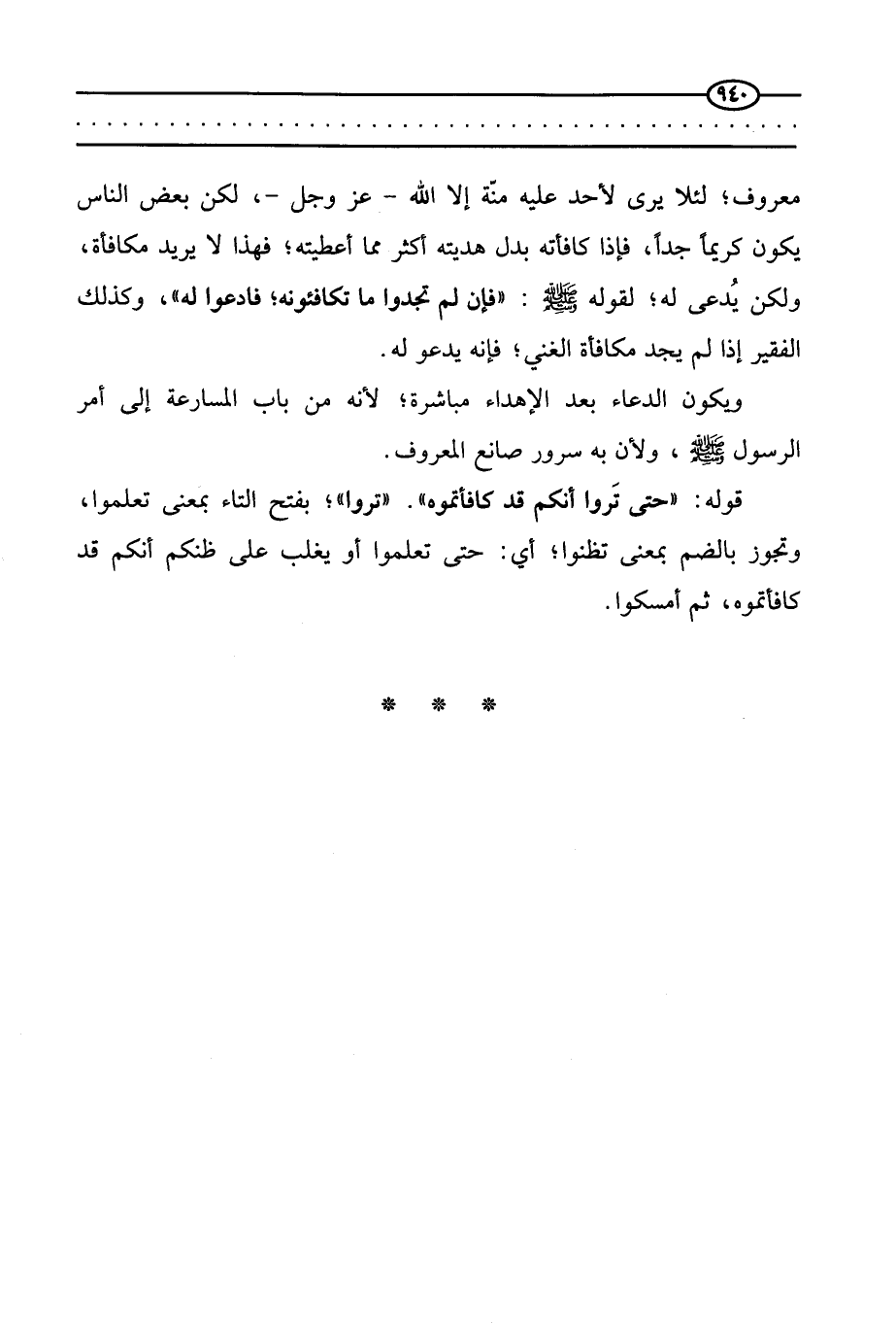 معروفا، لئلا يرى لأحد عليه منة إلا الله عز وجل، لكن بعض الناس يكون كريما جدا، فإذا كافأته بدل هديته أكثر مما أعطيته، فهذا لا يريد مكافأة، ولكن يُدعى له، لقوله صَلَّى اللَّهُ عَلَيْهِ وَسَلَّمَ: «فإن لم تجدوا ما تكافئونه، فادعوا له» وكذلك الفقير إذا لم يجد مكافأة الغني فإنه يدعو له.