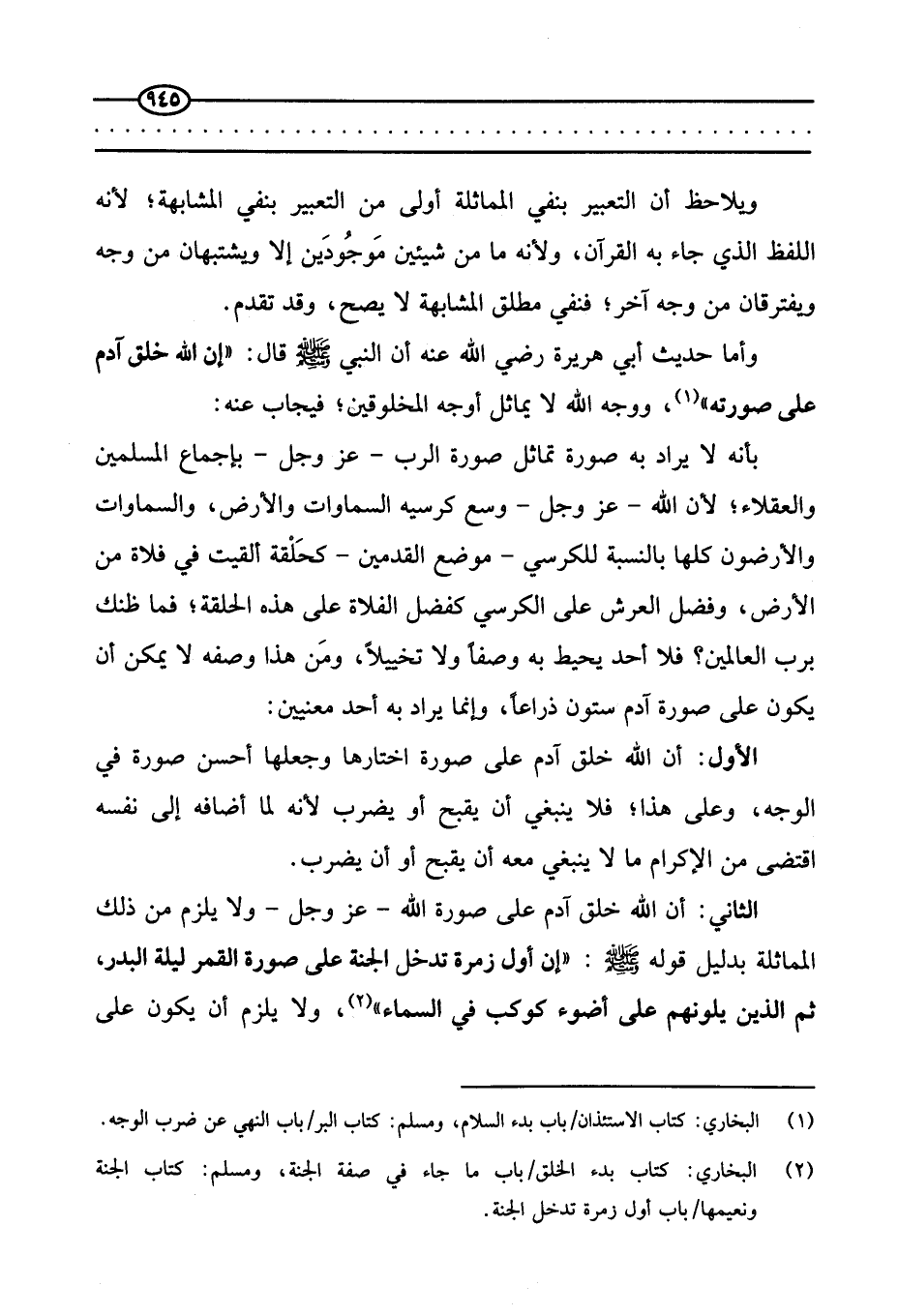 الثاني: أن الله خلق آدم على صورة الله - عز وجل - ولا يلزم من ذلك المماثلة بدليل قوله - صَلَّى اللَّهُ عَلَيْهِ وَسَلَّمَ -: «إن أول زمرة تدخل الجنة على صورة القمر ليلة البدر ثم الذين يلونهم على أضوأ كوكب في السماء» ، ولا يلزم أن يكون على