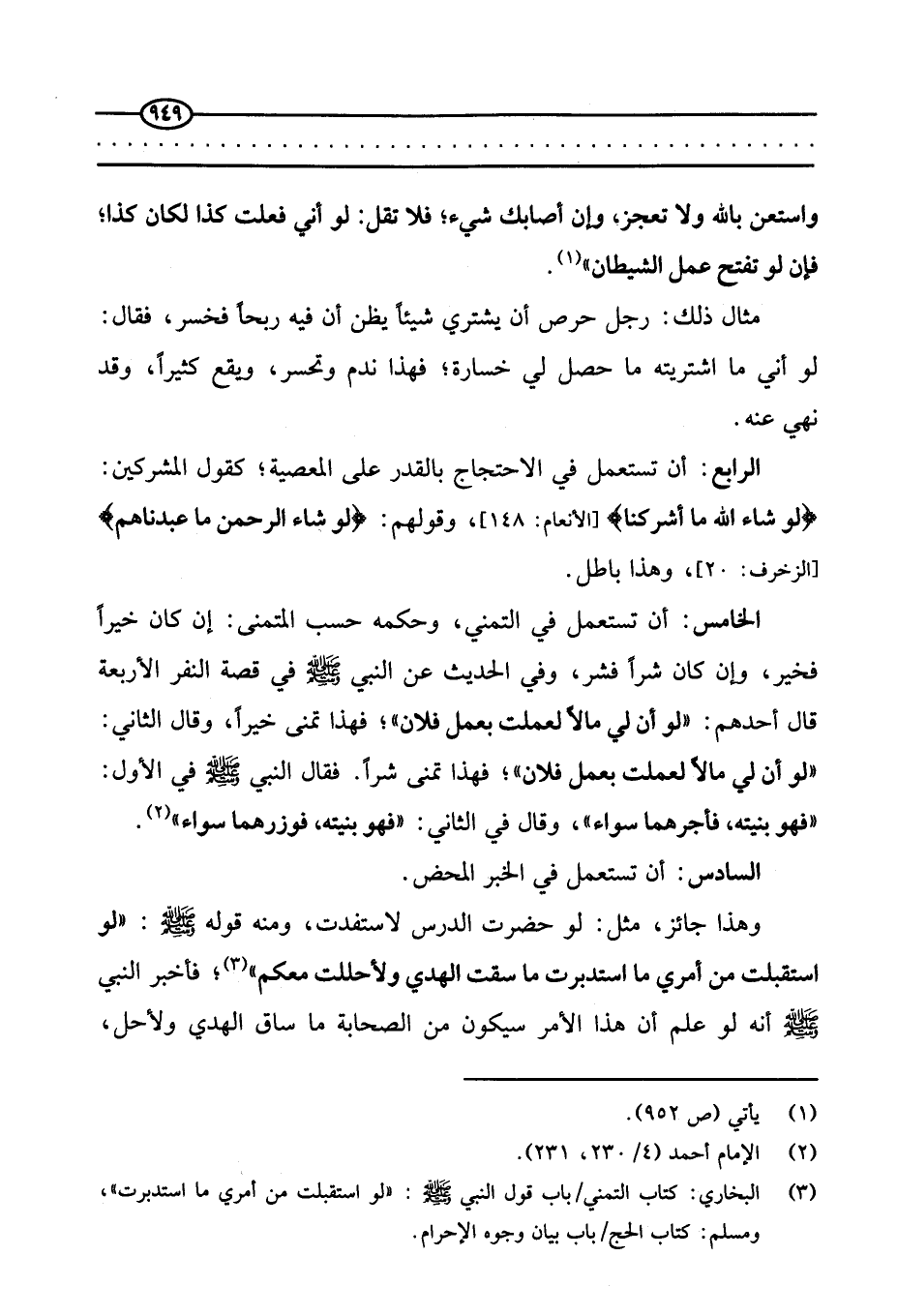 الخامس: أن تستعمل في التمني، وحكمه حسب المتمنى: إن كان خيرا فخير، وإن كان شرا فشر، وفي الحديث عن النبي - صَلَّى اللَّهُ عَلَيْهِ وَسَلَّمَ - في قصة النفر الأربعة قال أحدهم: «لو أن لي مالا لعملت بعمل فلان» فهذا تمنى خيرا، وقال الثاني: «لو أن لي مالا لعملت بعمل فلان» ، فهذا تمنى شرا. فقال النبي - صَلَّى اللَّهُ عَلَيْهِ وَسَلَّمَ - في الأول: «فهو بنيته، فأجرهما سواء» ، وقال في الثاني: «فهو بنيته، فوزرهما سواء» . (¬1)