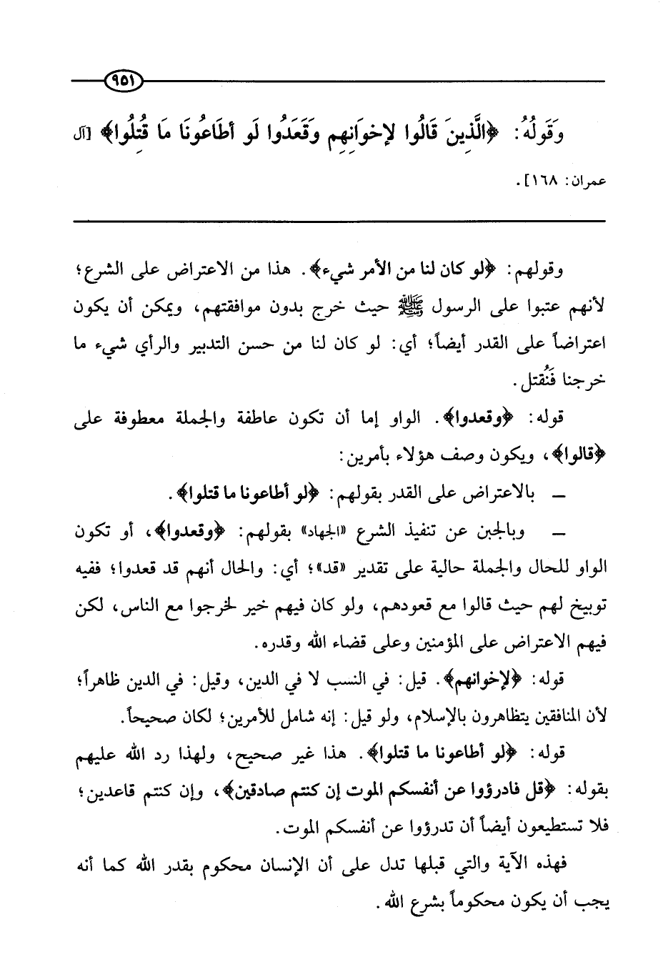 قوله: {لَوْ أَطَاعُونَا مَا قُتِلُوا} . هذا غير صحيح، ولهذا رد الله عليهم بقوله: {قُلْ فَادْرَءُوا عَنْ أَنْفُسِكُمُ الْمَوْتَ إِنْ كُنْتُمْ صَادِقِينَ} ، وإن كنتم قاعدين، فلا تستطيعون أيضا أن تدرءوا عن أنفسكم الموت.