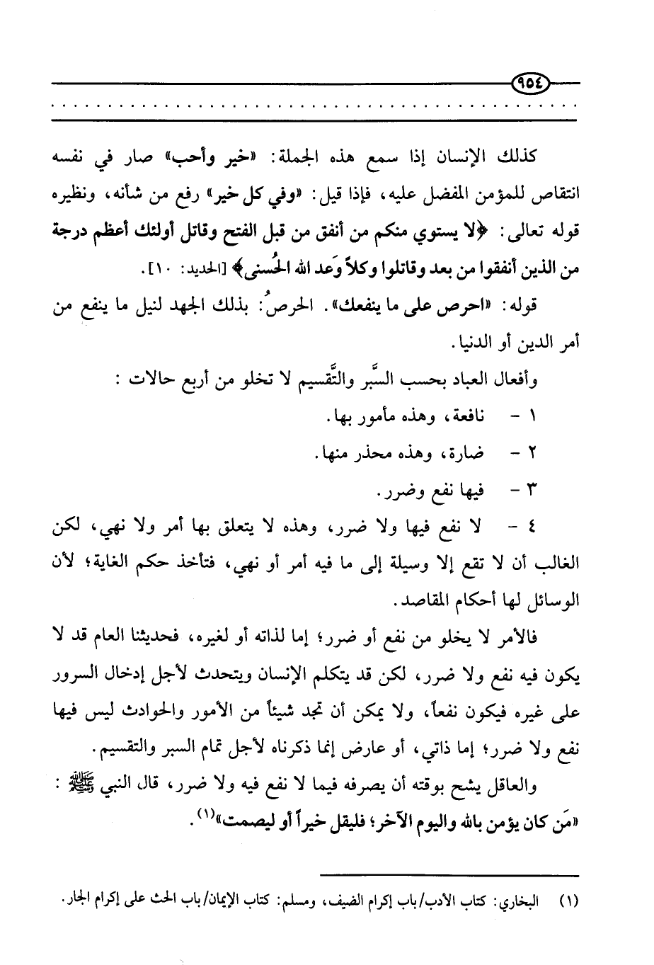 والعاقل يشح بوقته أن يصرفه فيما لا نفع فيه ولا ضرر، قال النبي - صَلَّى اللَّهُ عَلَيْهِ وَسَلَّمَ -: «من كان يؤمن بالله واليوم الآخر، فليقل خير أو ليصمت» .