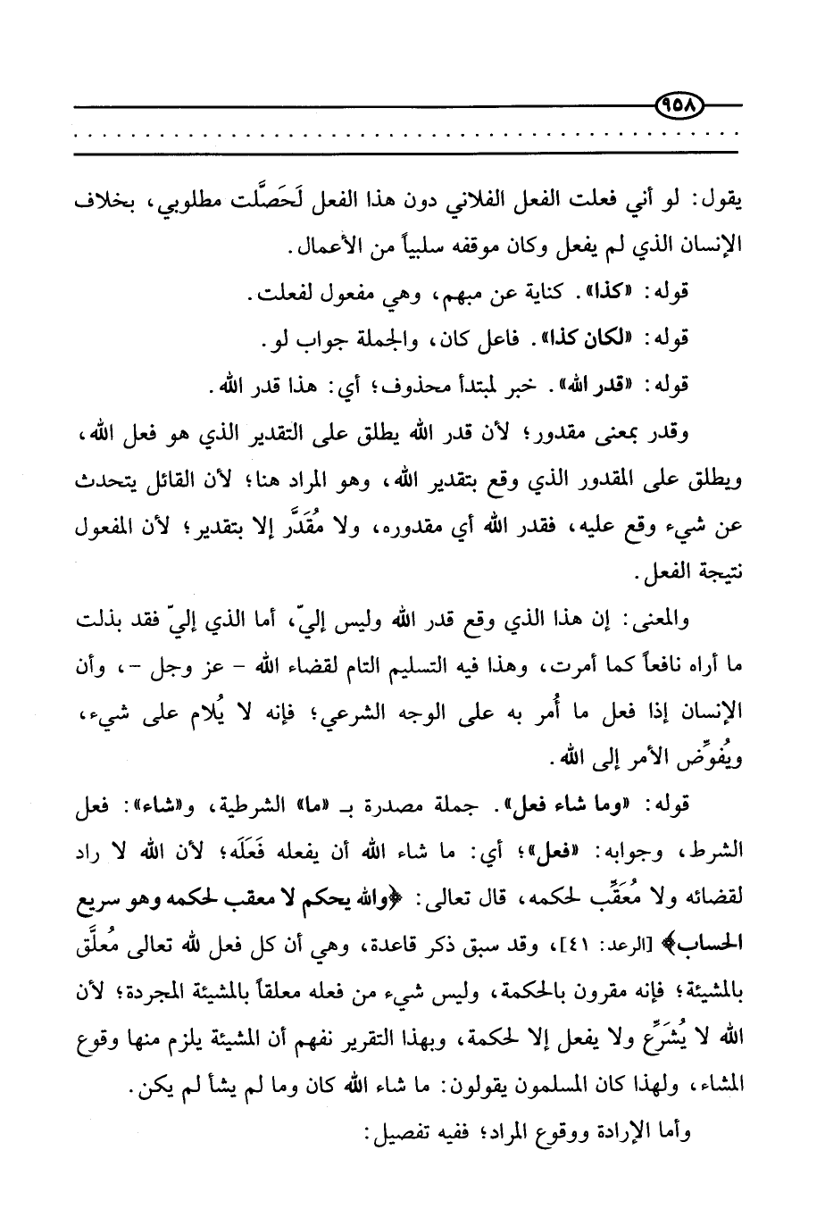 وقدر بمعنى مقدور؛ لأن الله يطلق على التقدير الذي هو فعل الله، ويطلق على المقدور الذي وقع بتقدير الله، وهو المراد هنا؛ لأن القائل يتحدث عن شيء وقع عليه، فقدر الله أي مقدوره، ولا مقدر إلا بتقدير؛ لأن المفعول نتيجة الفعل.