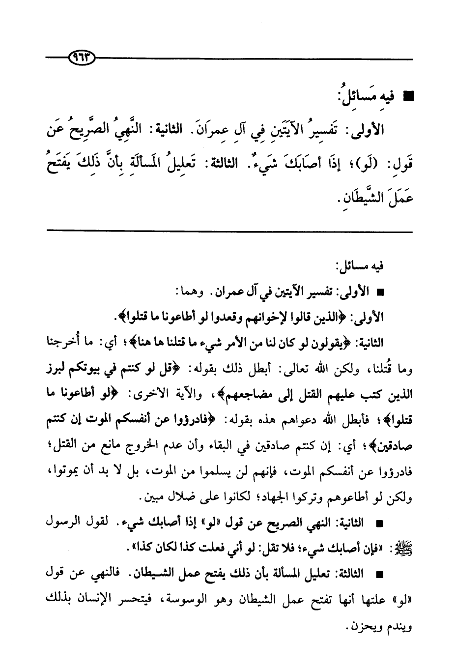 الأولى: تفسير الآيتين في آل عمران. الثانية: النهي الصريح عن قول " لو " إذا أصابك شيء. الثالثة: تعليل المسألة بأن ذلك يفتح عمل الشيطان.