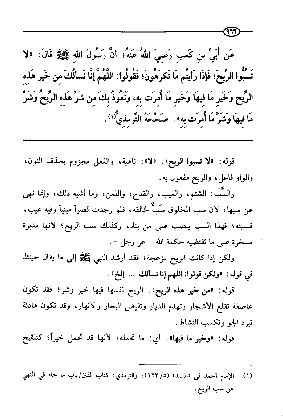 عن أُبي بن كعب رضي الله عنه؛ أن رسول الله - صَلَّى اللَّهُ عَلَيْهِ وَسَلَّمَ - قال: «لا تسبوا الريح؛ فإذا رأيتم ما تكرهون؛ فقولوا: اللهم إنا نسألك من خير هذه الريح وشر ما فيها وشر ما أمرت به» . صححه الترمذي