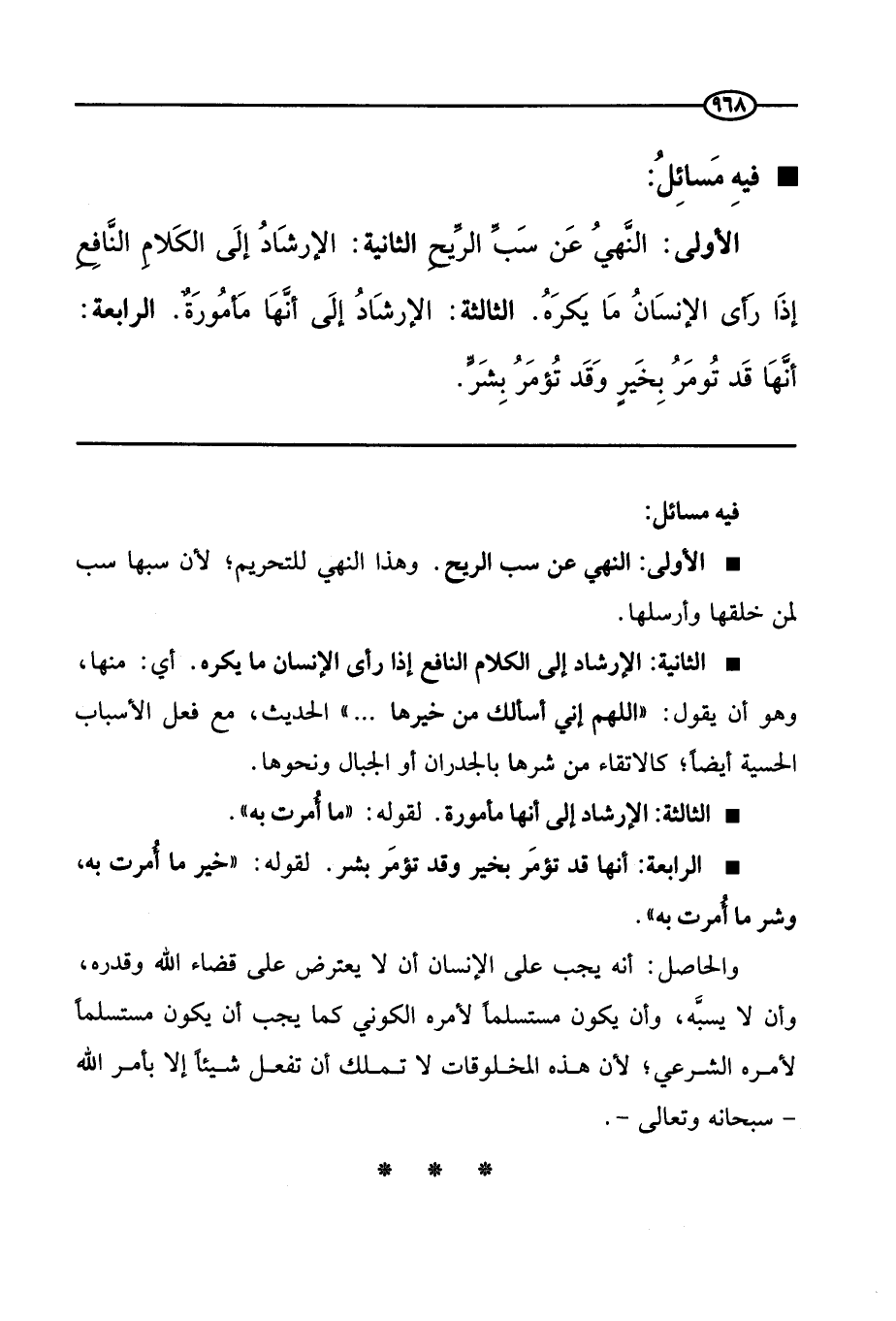 الأولى: النهي عن سب الريح الثانية: الإرشاد إلى الكلام النافع إذا رأى الإنسان ما يكره. الثالثة: الإرشاد إلى أنها مأمورة. الرابعة: أنها قد تؤمر بخير وقد تؤمر بشر.
