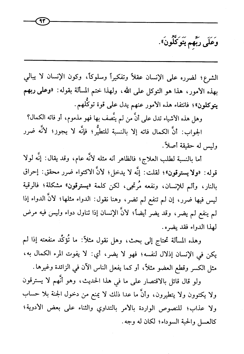 التاسعة: فضيلة هذه الأمة بالكمية والكيفية، أما الكمية؛ فلأن النبي صَلَّى اللَّهُ عَلَيْهِ وَسَلَّمَ رأى سوادًا عظيمًا أعظم من السواد الذي كان مع موسى، وأما الكيفية؛ فلأن معهم هؤلاء الذين لا يسترقون ولا يكتوون ولا يتطيرون وعلى ربهم يتوكلون.