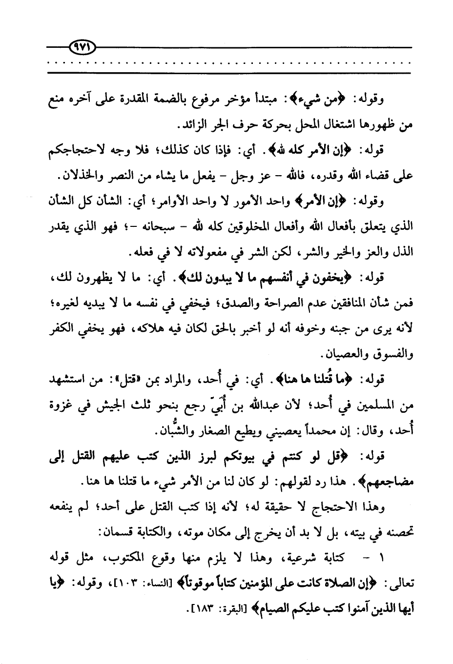 قوله: {قُلْ لَوْ كُنْتُمْ فِي بُيُوتِكُمْ لَبَرَزَ الَّذِينَ كُتِبَ عَلَيْهِمُ الْقَتْلُ إِلَى مَضَاجِعِهِمْ} . هذا رد لقولهم: لو كان لنا من الأمر شيء ما قتلنا هاهنا.