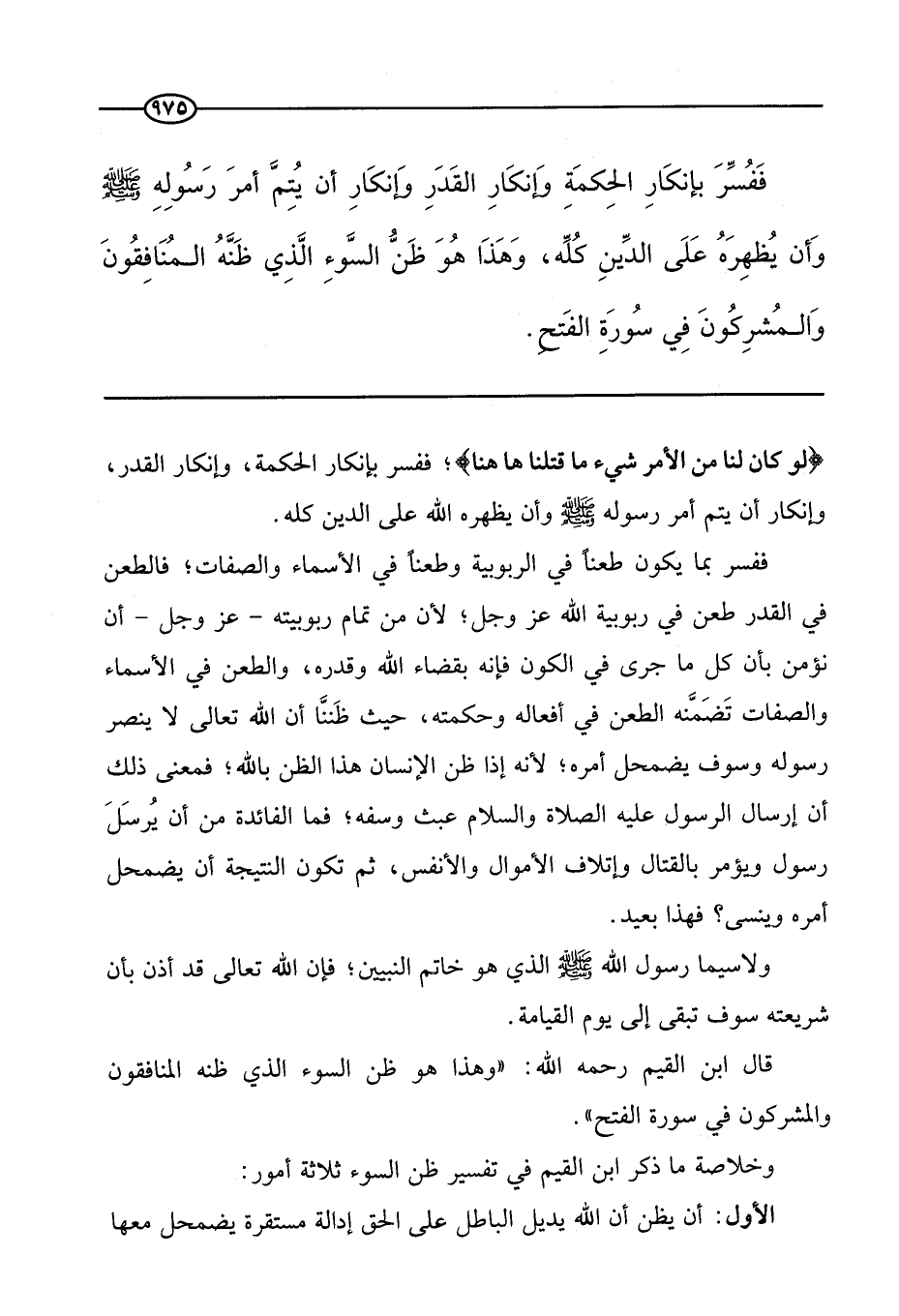 وخلاصة ما ذكر ابن القيم في تفسير ظن السوء ثلاثة أمور:
