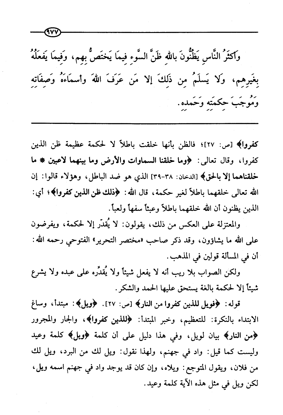قوله: {فَوَيْلٌ لِلَّذِينَ كَفَرُوا مِنَ النَّارِ} (ص:27) (ويل) : مبتدأ، وساغ الابتداء بالنكرة: للتعظيم، وخبر المبتدأ: (للذين كفروا) ، والجار والمجرور (من النار) بيان لويل، وفي هذا دليل على أن كلمة (ويل) كلمة وعيد وليست كما قيل: واد في جهنم، ولهذا نقول: ويل لك من البرد، ويل لك من فلان، ويقول المتوجع: ويلاه، وإن كان قد يوجد واد في جهنم اسمه ويل، لكن ويل في مثل هذه الآية كلمة وعيد.