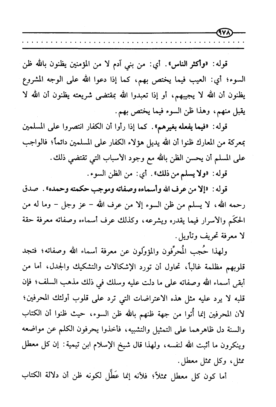 قوله: (إلا من عرف الله وأسماءه وصفاته وموجب حكمته وحمده) . صَدَقَ رَحِمَهُ الله، لا يسلم من ظن السوء إلا من عرف الله - عز وجل - وما له من الحِكَم والأسرار فيما يقدره ويشرعه، وكذلك عرف أسماءه وصفاته معرفة حقة لا معرفة تحريف وتأويل.