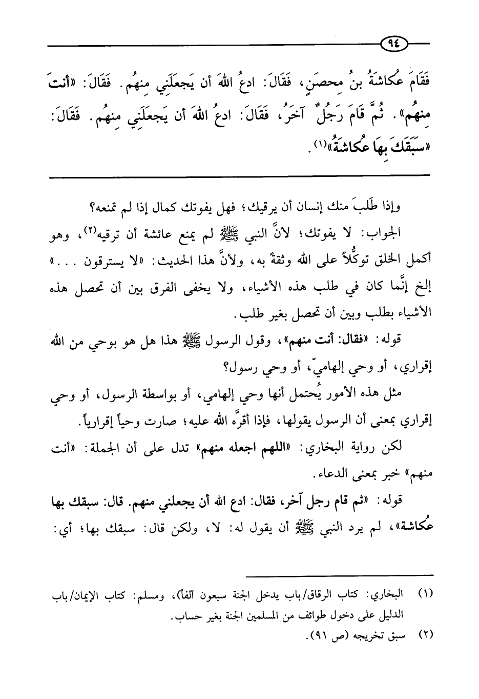 الثانية عشرة: أن كل أمة تحشر وحدها مع نبيها. الثالثة عشرة: قلة من استجاب للأنبياء. الرابعة عشرة: أن من لم يجبه أحد وحده. الخامسة عشرة: ثمرة هذا العلم، وهو عدم الاغترار بالكثرة, وعدم الزهد في القلة.