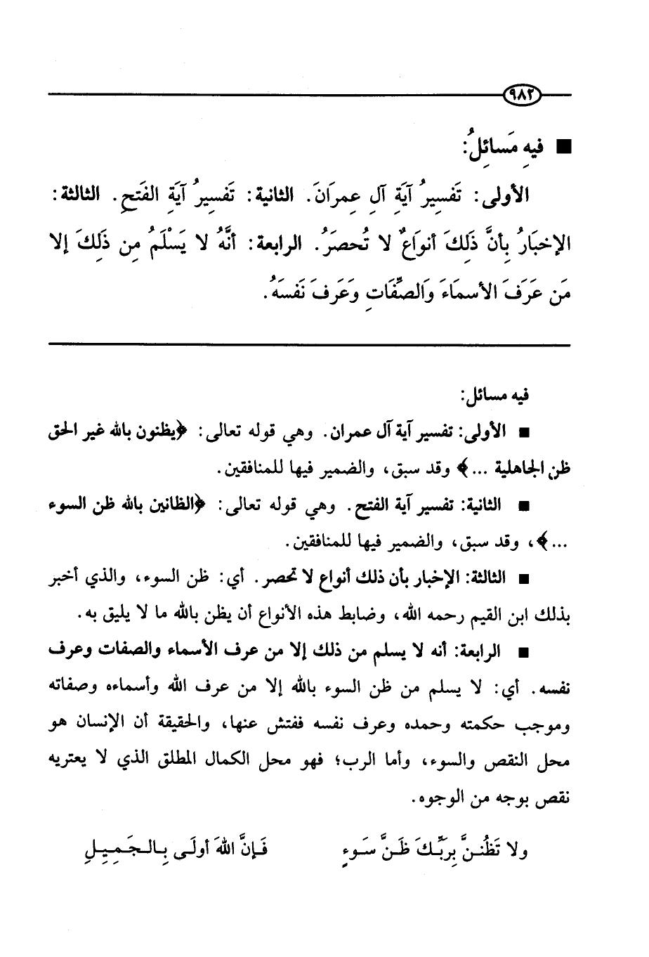 الأولى: تفسير آية آل عمران. الثانية: تفسير آية الفتح. الثالثة: الإخبار بأن ذلك أنواع لا تحصر. الرابعة: أنه لا يسلم من ذلك إلا من عرف الأسماء والصفات وعرف نفسه.