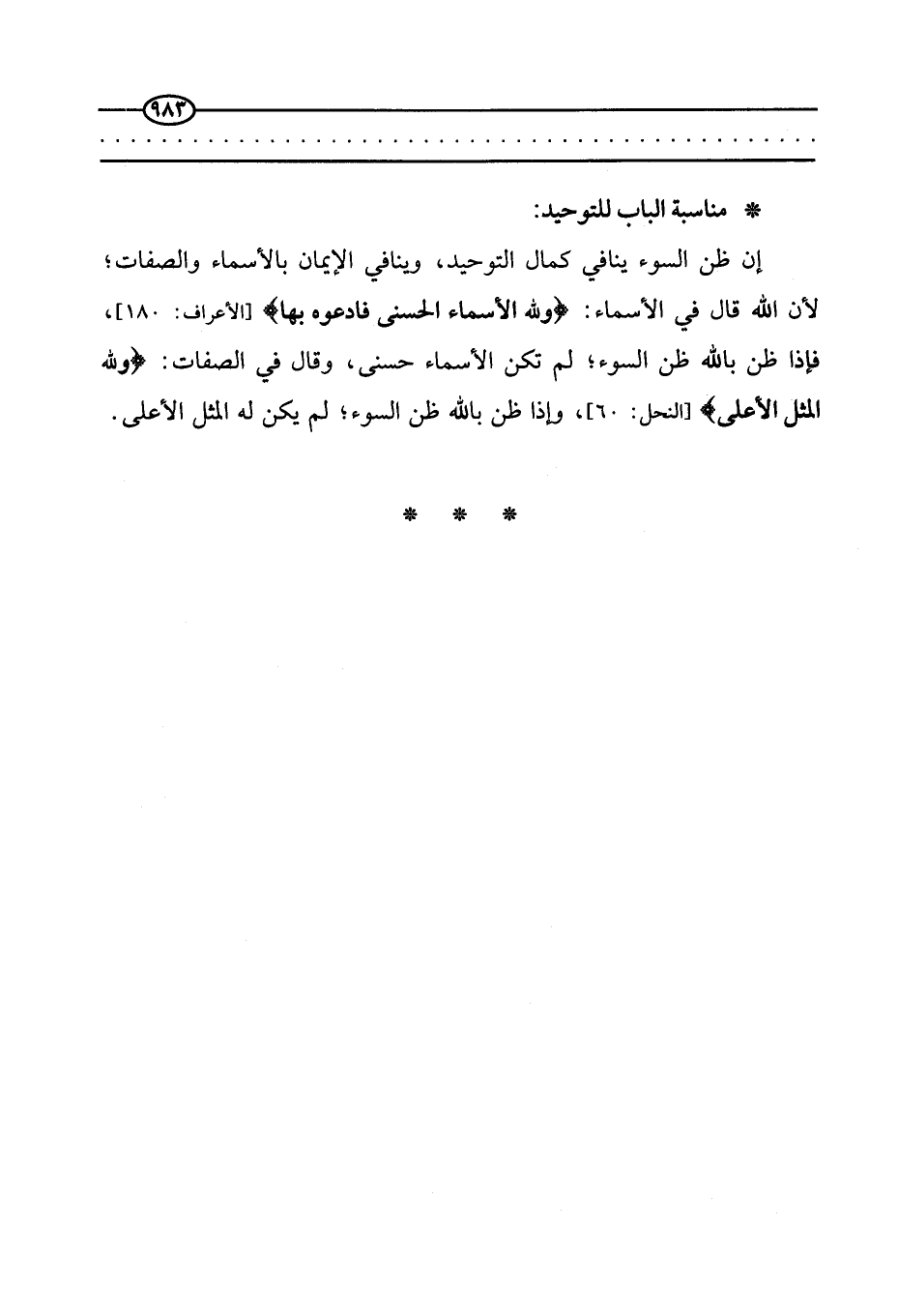 إن ظن السوء ينافي كمال التوحيد، وينافي الإيمان بالأسماء والصفات؛ لأن الله قال في الأسماء: {وَلِلَّهِ الْأَسْمَاءُ الْحُسْنَى فَادْعُوهُ بِهَا} (الأعراف: 18) فإذا ظن بالله ظن السوء، لم تكن الأسماء حسنى، وقال في الصفات: {وَلِلَّهِ الْمَثَلُ الْأَعْلَى} (النحل:60) ، وإذا ظن بالله ظن السوء، لم يكن له المثل الأعلى.