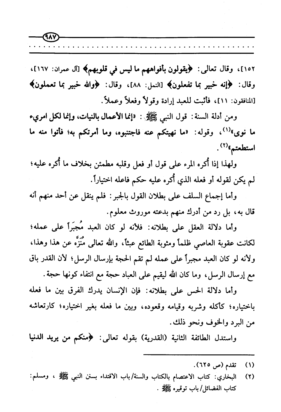 وقال تعالى: {يَقُولُونَ بِأَفْواهِهِمْ مَا لَيْسَ فِي قُلُوبِهِمْ} (آل عمران: 167) وقال: {إِنَّهُ خَبِيرٌ بِمَا تَفْعَلُونَ} (النمل: 88) ، وقال تعالى: {وَاللَّهُ خَبِيرٌ بِمَا تَعْمَلُونَ} (المنافقون:11) فأثبت للعبد إرادة وقولا وفعلا وعملا.