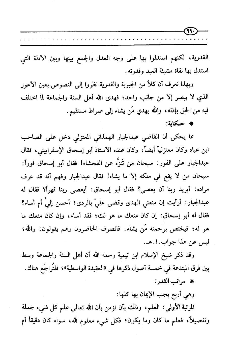 مما يحكى أن القاضي عبد الجبار الهمذاني المعتزلي دخل على الصاحب ابن عباد وكان معتزليا أيضا، وكان عنده الأستاذ أبو إسحاق الإسفراييني، فقال عبد الجبار على الفور: سبحان من تنزه عن الفحشاء! فقال أبو إسحاق فورا: سبحان من لا يقع في ملكه إلا ما يشاء! فقال عبد الجبار وفهم أنه قد عرف مراده: أيريد ربنا أن يعصى؟ فقال أبو إسحاق: أيعصى ربنا قهرا؟ فقال له عبد الجبار: أرأيت إن منعني الهدى وقضى عليَّ بالردى، أحسن إليّ أم أساء؟ فقال له أبو إسحاق: إن كان منعك ما هو لك، فقد أساء، وإن كان منعك ما هو له، فيختص برحمته من يشاء. فانصرف الحاضرون وهم يقولون: والله، ليس عن هذا جواب. ا. هـ.