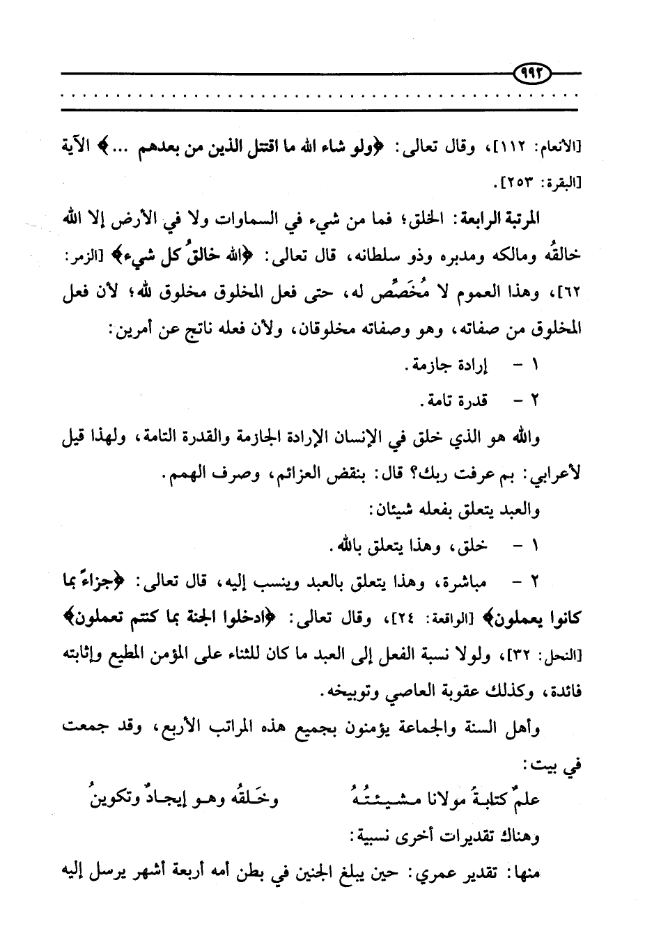 وأهل السنة والجماعة يؤمنون بجميع هذه المراتب الأربع، وقد جمعت في بيت: