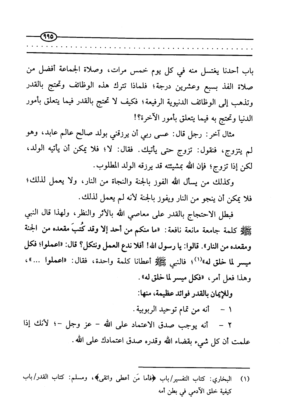 باب أحدنا يغتسل منه في كل يوم خمس مرات، وصلاة الجماعة أفضل من صلاة الفذ بسبع وعشرين درجة، فلماذا تترك هذه الوظائف وتحتج بالقدر وتذهب إلى الوظائف الدنيوية الرفيعة، فكيف لا تحتج بالقدر فيما يتعلق بأمور الدنيا وتحتج به فيما يتعلق بأمور الآخرة؟