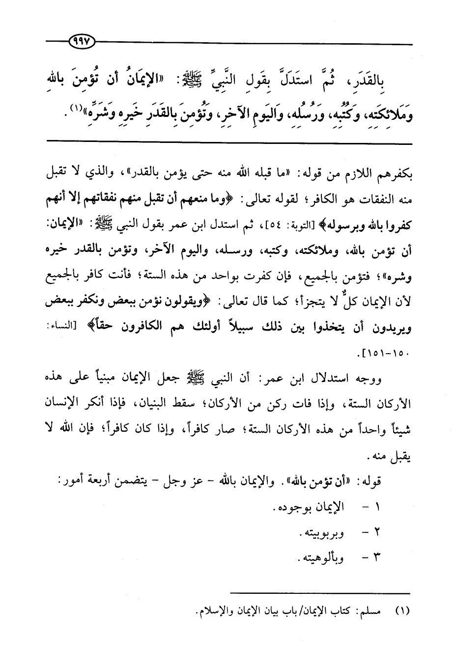 ووجه استدلال ابن عمر: أن النبي صَلَّى اللَّهُ عَلَيْهِ وَسَلَّمَ جعل الإيمان مبنيا على هذه الأركان الستة، وإذا فات ركن من الأركان، سقط البنيان، فإذا أنكر الإنسان شيئا واحدا من هذه الأركان الستة، صار كافرا، وإذا كان كافرا، فإن الله لا يقبل منه.