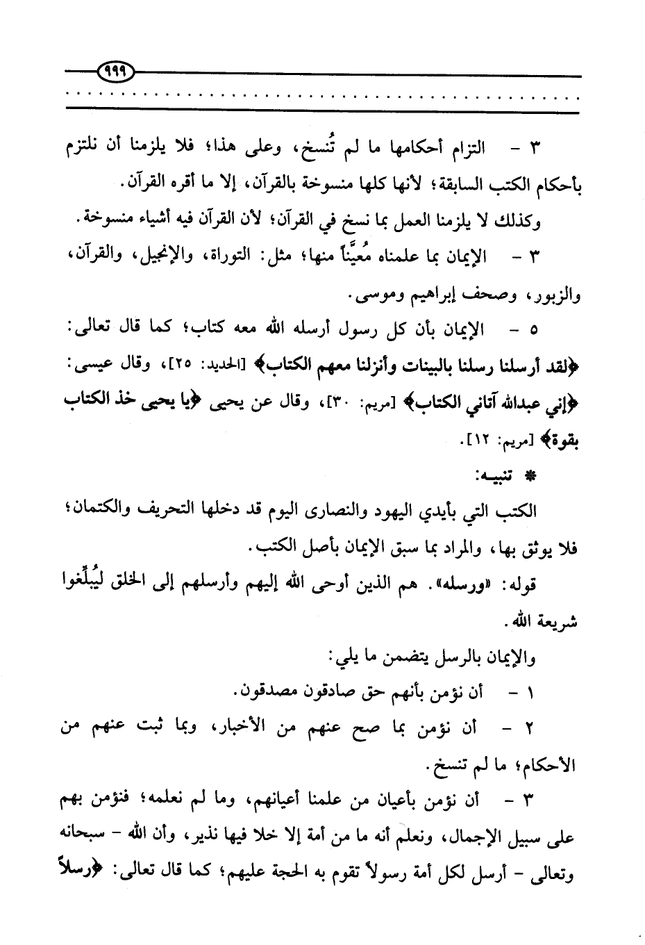 5 - الإيمان بأن كل رسول أرسله الله معه كتاب، كما قال الله تعالى: {لَقَدْ أَرْسَلْنَا رُسُلَنَا بِالْبَيِّنَاتِ وَأَنْزَلْنَا مَعَهُمُ الْكِتَابَ} (الحديد:25) وقال عيسى: {إِنِّي عَبْدُ اللَّهِ آتَانِيَ الْكِتَابَ} (مريم: 30) ??، وقال عن يحيى {يَايَحْيَى خُذِ الْكِتَابَ بِقُوَّةٍ} (مريم 12) .