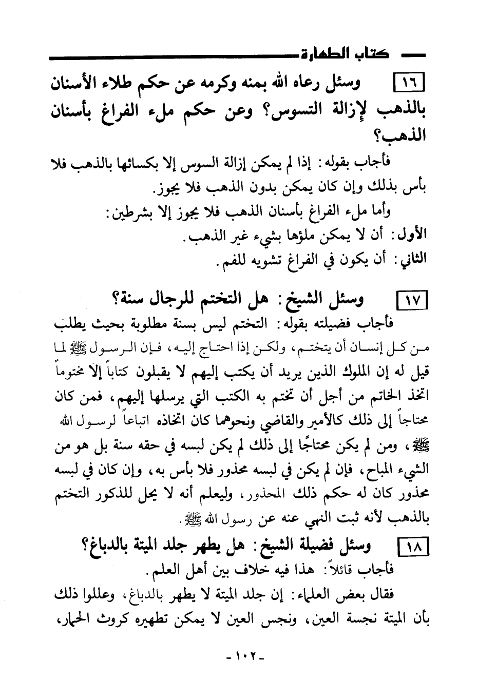 16) وسُئل رعاه الله بمنه وكرمه عن حكم طلاء الأسنان بالذهب لإزالة التسوس؟ وعن حكم ملء الفراغ بأسنان الذهب؟