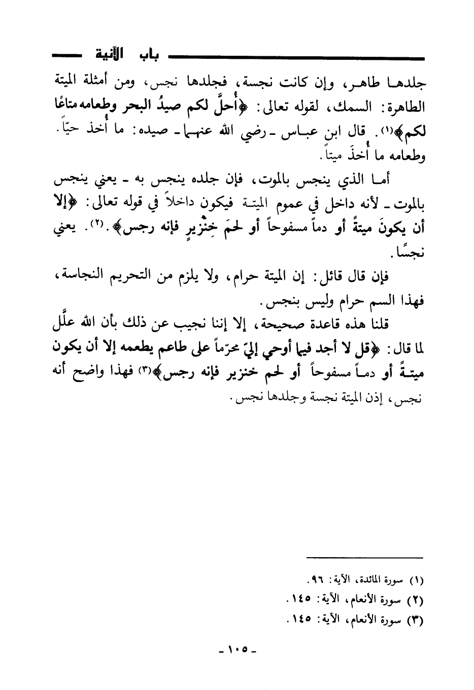 أما الذي ينجس بالموت، فإن جلده ينجس به - يعني ينجس بالموت - لأنه داخل في عموم الميتة فيكون داخلاً في قوله تعالى: (إلا أن يكونَ ميتة ً أو دماً مسفوحاً أو لحمَ خنزيرٍ فإنه رجس) (2) . يعني نجساً.