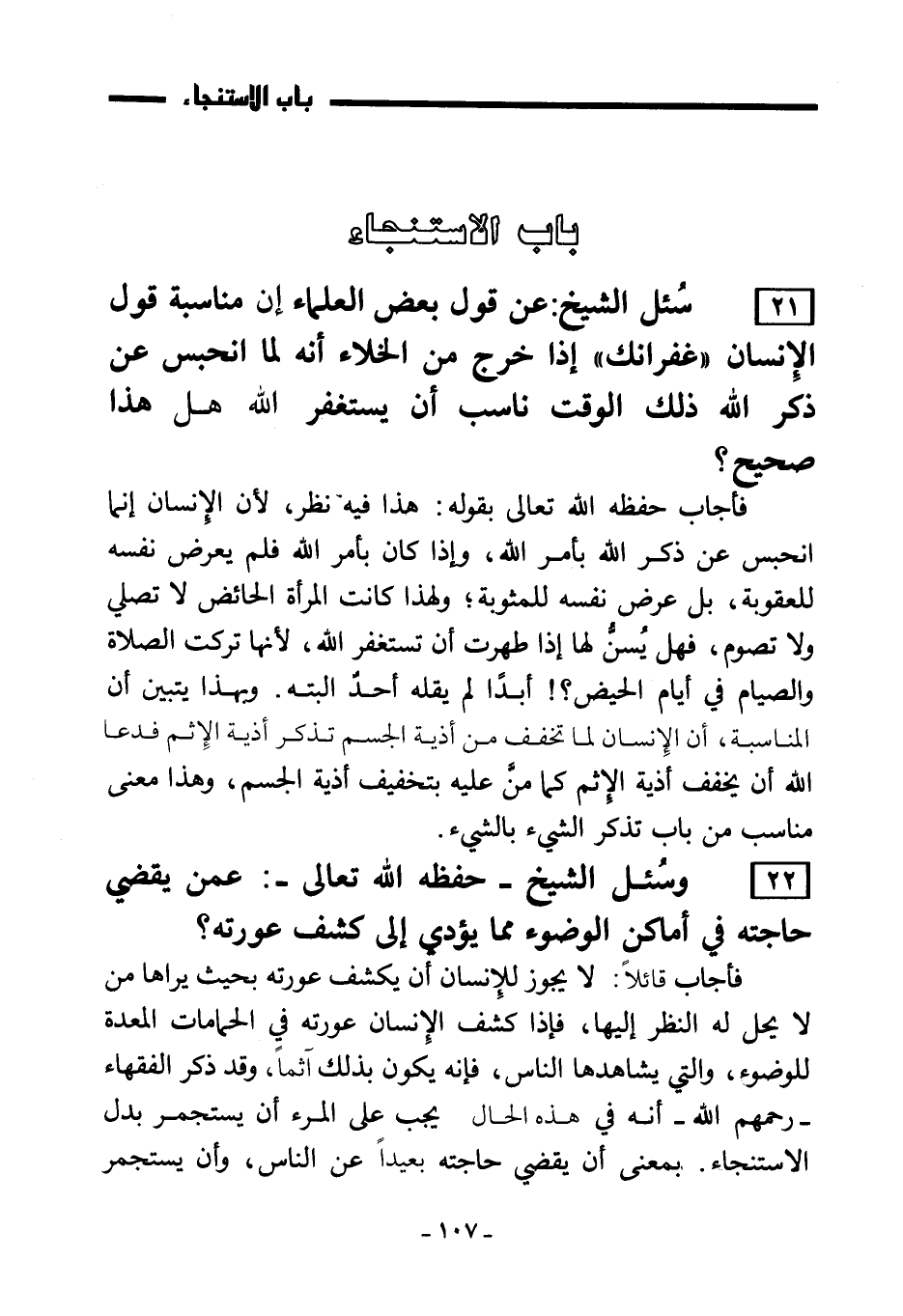 21) سُئل الشيخ: عن قول بعض العلماء إن مناسبة قول الإنسان " غفرانك " إذا خرج من الخلاء أنه لما انحبس عن ذكر الله ذلك الوقت ناسب أن يستغفر الله هل هذا صحيح؟