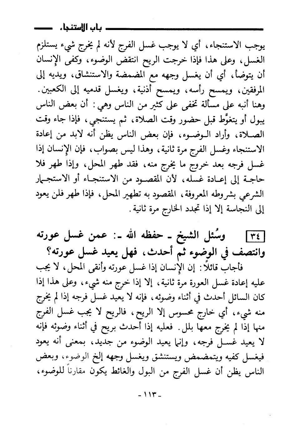 34) وسُئل الشيخ - حفظه الله: - عمن غسل عورته وانتصف الوضوء ثم أحدث، فهل يعيد غسل عورته؟