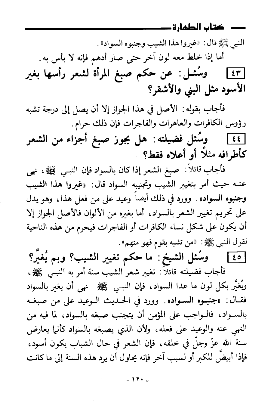 43) وسُئل: عن حكم صبغ المرأة لشعر رأسها بغير الأسود مثل البني والأشعر؟