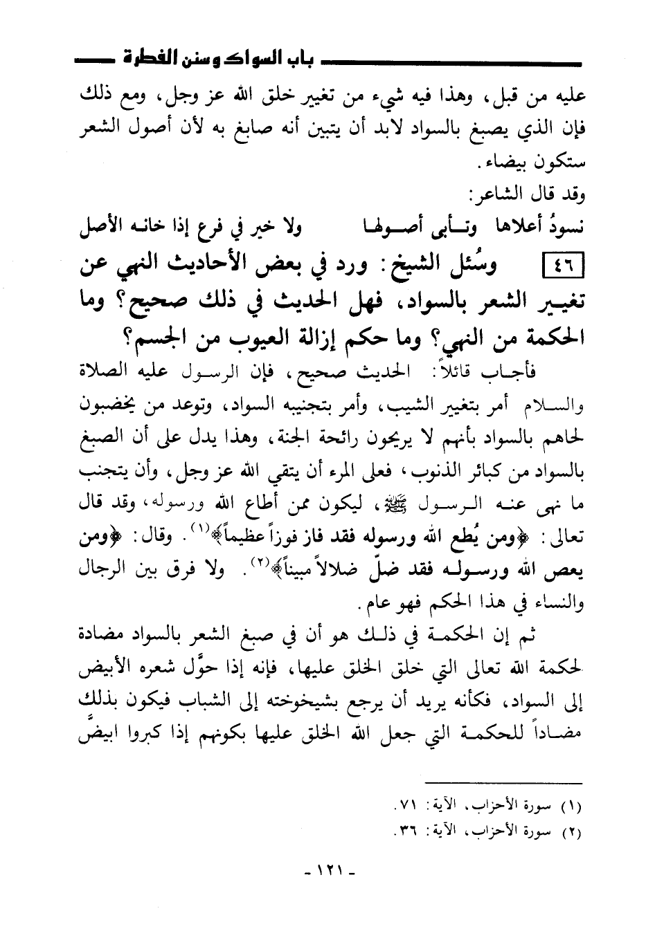 46) وسُئل الشيخ: ورد في بعض الأحاديث النهي عن تغيير الشعر بالسواد، فهل الحديث في ذلك صحيح؟ وما الحكمة من النهي؟ وما حكم إزالة العيوب من الجسم؟
