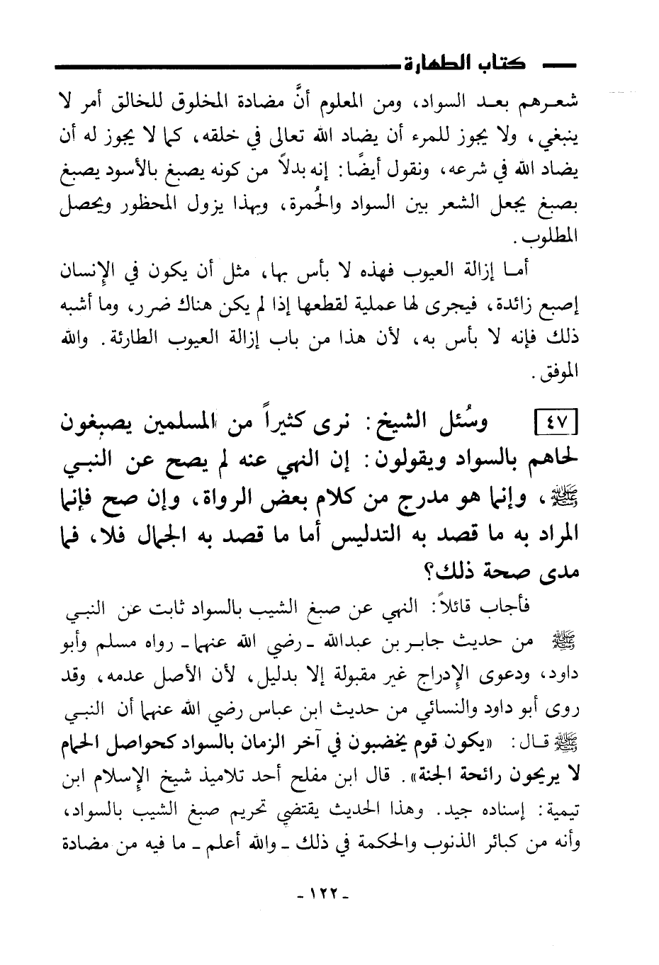 47) وسُئل الشيخ: نرى كثيراً من المسلمين يصبغون لحاهم بالسواد ويقولون: إن النهي عنه لم يصح عن النبي صلى الله عليه وسلم، وإنما هو مدرج من كلام بعض الرواة وإن صح فإنما المراد به ما قصد به التدليس أما ما قصد به الجمال فلا، فما مدى صحة ذلك؟