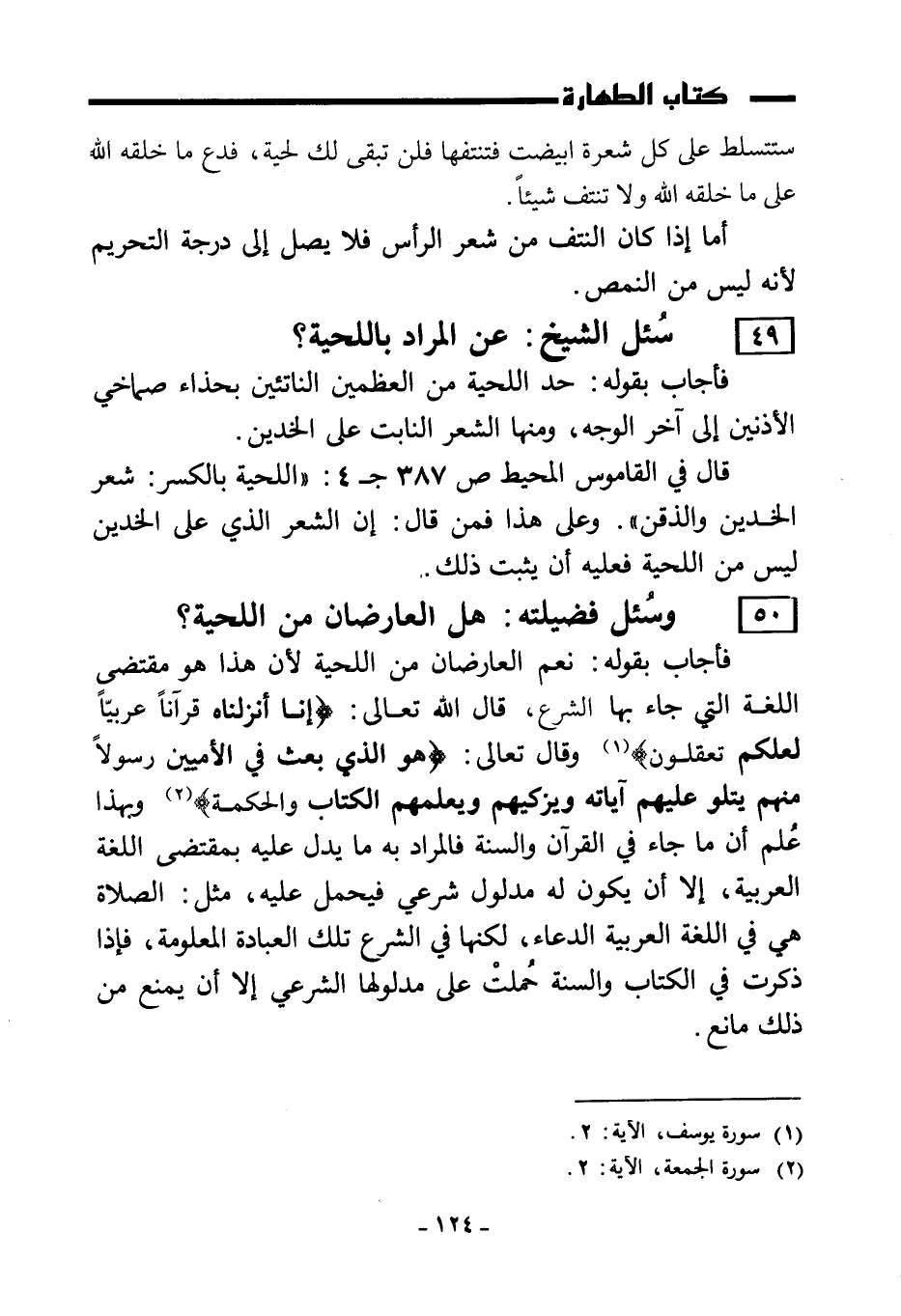 فأجاب بقوله: نعم العارضان من اللحية لأن هذا هو مقتضى اللغة التي جاء بها الشرع، قال الله تعالى: (إنا أنزلناه قرآناً عربيّاً لعلكم تعقلون) (1) . وقال تعالى: (هو الذي بعث في الأميين رسولاً منهم يتلو عليهم آياته ويزكيهم ويعلمهم الكتاب والحكمة) (2) . وبهذا عُلم أن ما جاء في القرآن والسنة فالمراد به ما يدل عليه بمقتضى اللغة العربية، إلا أن يكون له مدلول شرعي فيحمل عليه، مثل: الصلاة هي في اللغة العربية الدعاء، لكنها في الشرع تلك العبادة المعلومة، فإذا ذكرت في الكتاب والسنة حُملتْ على مدلولها الشرعي إلا أن يمنع من ذلك مانع.