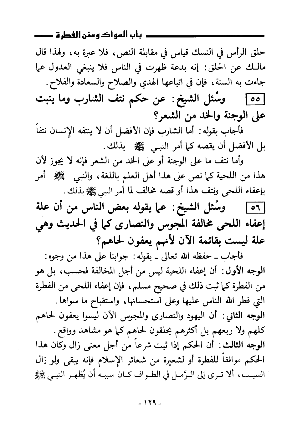 55) وسُئل الشيخ: عن حكم نتف الشارب وما ينبت على الوجنة والخد من الشعر؟