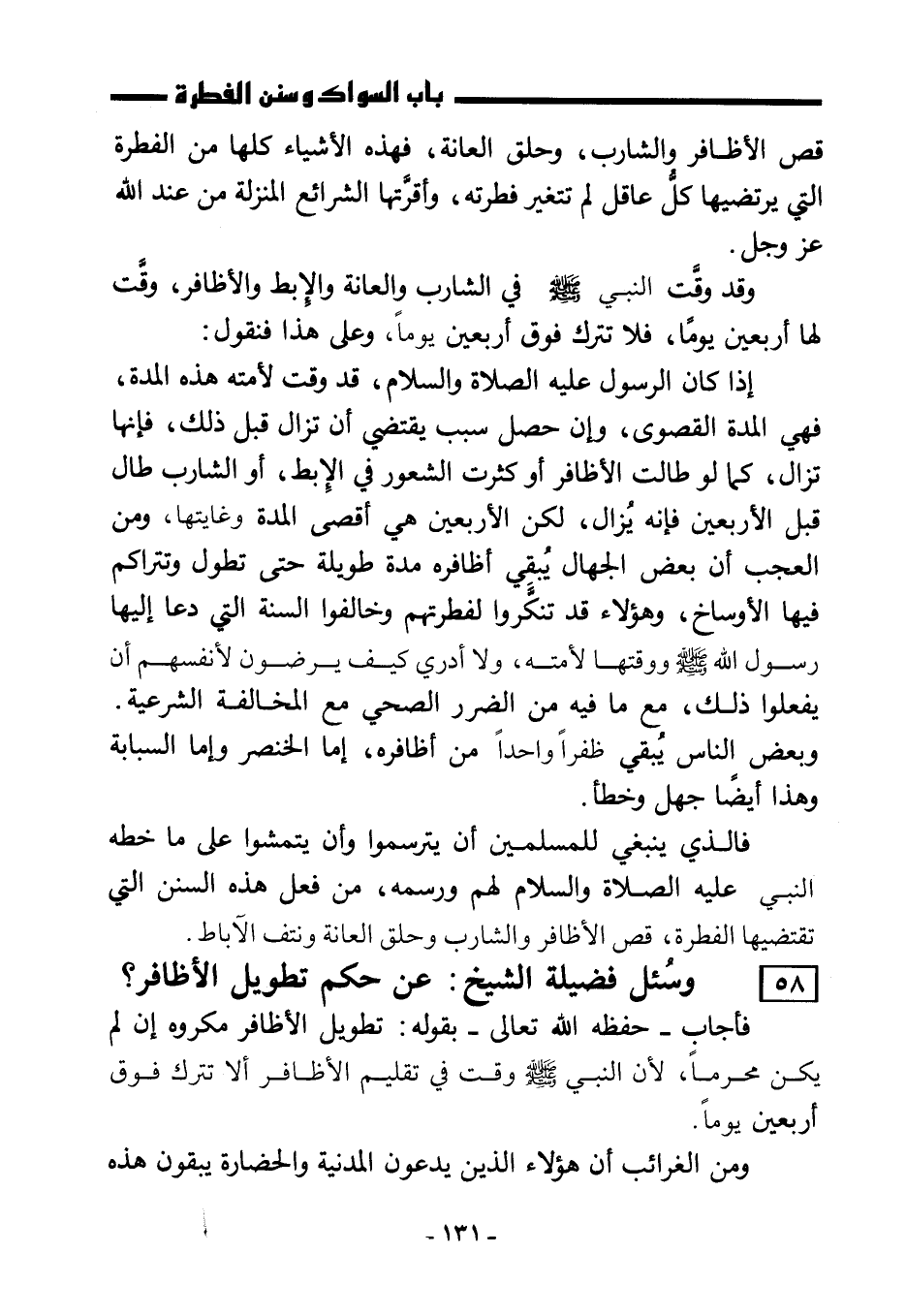 58) وسئل فضيلة الشيخ: عن حكم تطويل الأظافر؟