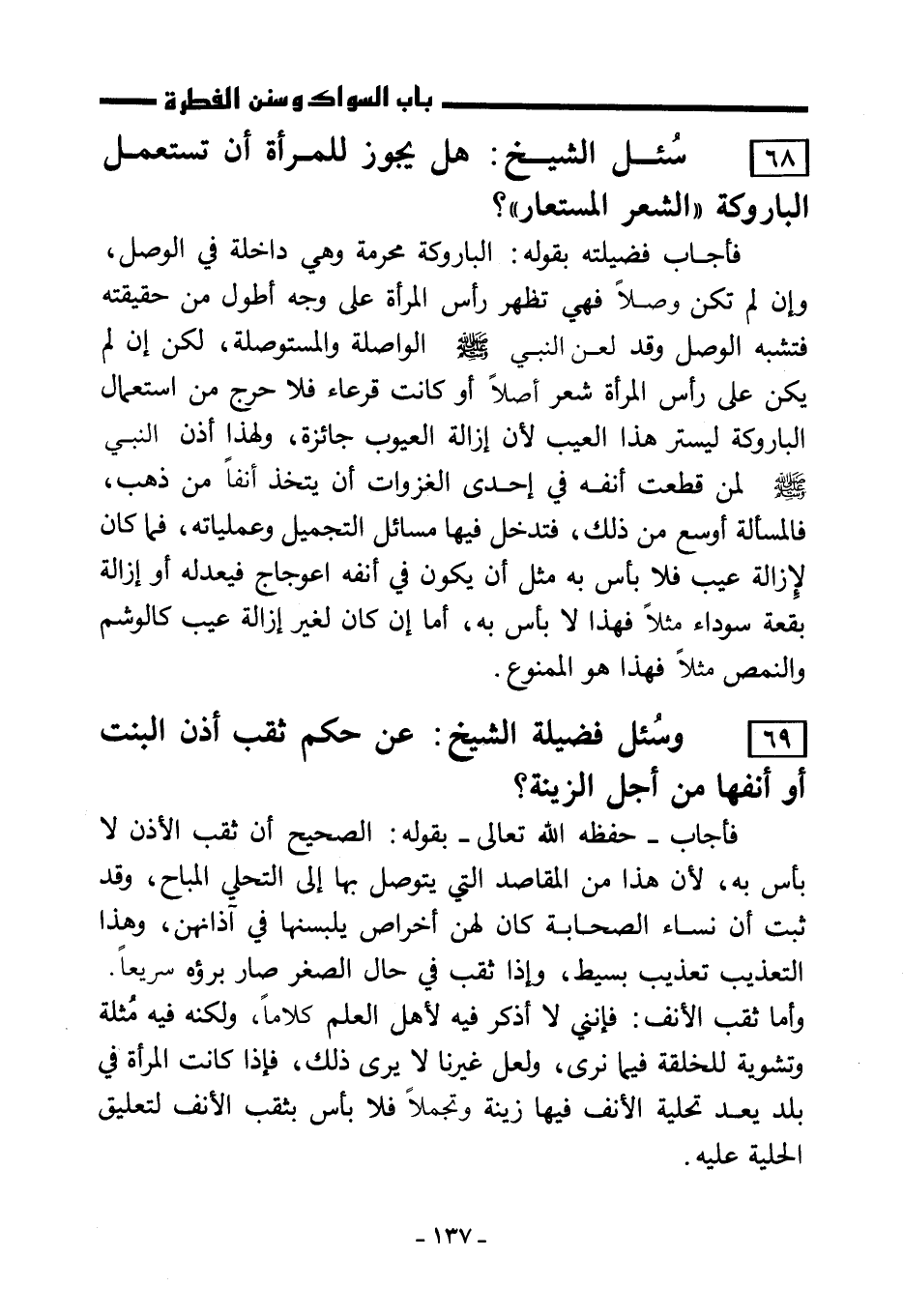 69) وسُئل فضيلة الشيخ: عن حكم ثقب اذن البنت أو أنفها من أجل الزينة؟