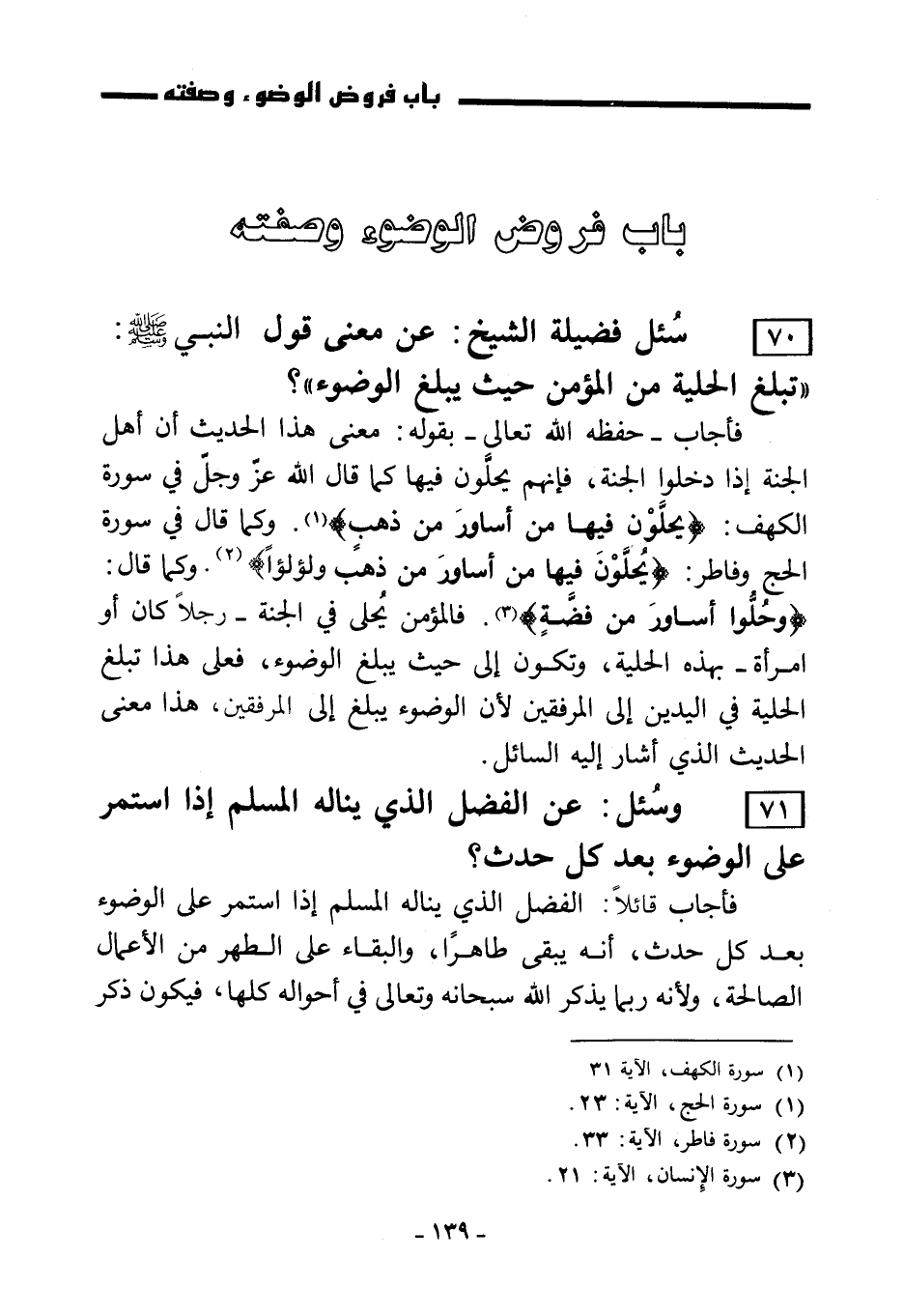 70) سُئل فضيلة الشيخ: عن معنى قول النبي صلى الله عليه وسلم: تبلغ الحلية من المؤمن حيث يبلغ الوضوء "؟