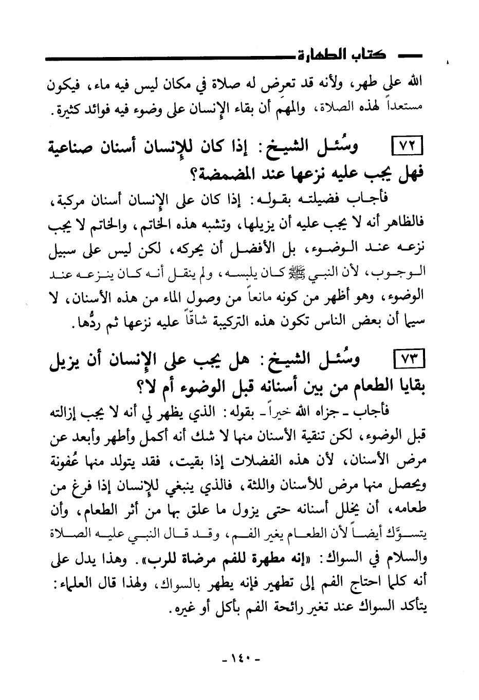 72) وسُئل الشيخ: إذا كان للإنسان أسنان صناعية فهل يجب عليه نزعها عند المضمضة؟