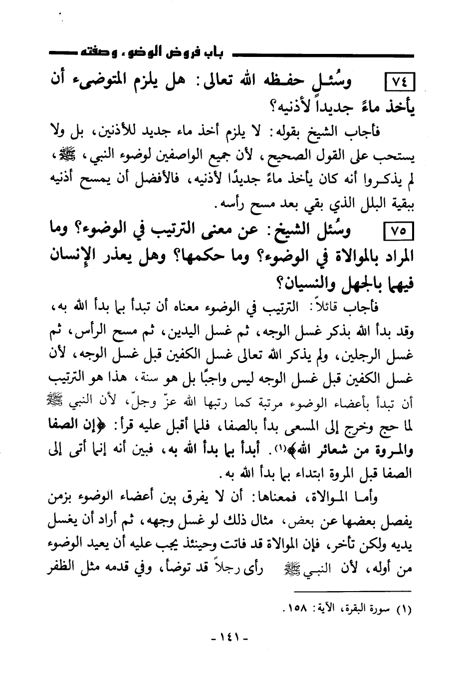 75) وسُئل الشيخ: عن معنى الترتيب في الوضوء؟ وما المراد بالموالاة في الوضوء؟ وما حكمها؟ وهل يعذر الإنسان فيهما بالجهل والنسيان؟