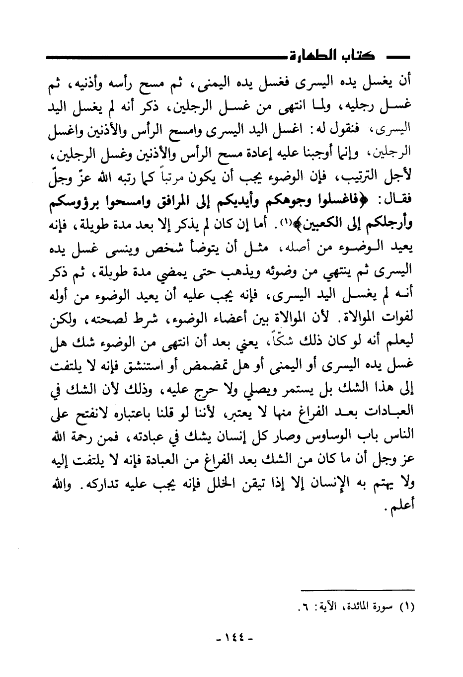 أن يغسل يده اليسرى فغسل يده اليمنى، ثم مسح راسه وأذنيه، ثم غسل رجليه، ولما انتهى من غسل الرجلين، ذكر أنه لم يغسل اليد اليسرى، فنقول له: اغسل اليد اليسرى وامسح الرأس والأذنين وأغسل الرجلين، وإنما أوجبنا عليه إعادة مسح الرأس والأذنين وغسل الرجلين، لأجل الترتيب، فإن الوضوء يجب أن يكون مرتباً كما رتبه الله عزّ وجلّ فقال: (فاغسلوا وجوهكم وأيديكم إلى المرافق وامسحوا برؤوسكم وأرجلكم إلى الكعبين) (1) . وأما إن كان لم يذكر إلا بعدة مدة طويلة، فإنه يعيد الوضوء من أصلة، مثل أن يتوضأ شخص وينسى غسل يده اليسرى ثم ينتهي من وضوئه ويذهب حتي يمضي مدة طويلة، ثم ذكر أنه لم يغسل اليد اليسرى، فإنه يجب عليه أن يعيد الوضوء من أوله لفوات المولاة بين أعضاء الوضوء، شرط لصحته، ولكن ليعلم أنه لو كان ذلك شكّاً، يعني بعد أن انتهى من الوضوء شك هل غسل يده اليسرى أو اليمنى أو هل تمضمض أو استنشق فإنه لا يلتفت إلى هذا الشك بل يستمر ويصلي ولا حرج عليه، وذلك لأن الشك في العبادات بعد الفراغ منها لا يعتبر، لأننا لو قلنا باعتباره لانفتح على الناس باب الوساوس وصار كل انسان يشك في عبادته، فمن رحمة الله عز وجل أن ما كان من الشك بعد الفراغ من البعادة فإنه لا يلتفت إليه ولا يهتم به الإنسان إلا إذا تيقن الخلل فإنه يجب عليه تداركه. الله أعلم.