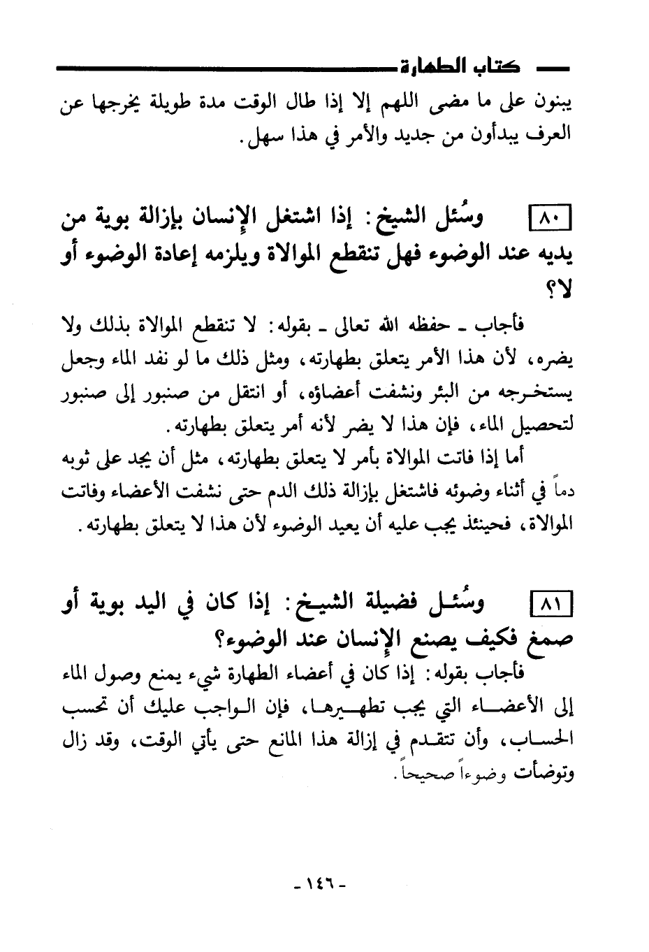 80) وسُئل الشيخ: إذا اشتغل الإنسان بإزالة بوية من يدية عند الوضوء فهل تنقطع الموالاة ويلزمه إعادة الوضوء أو لا؟