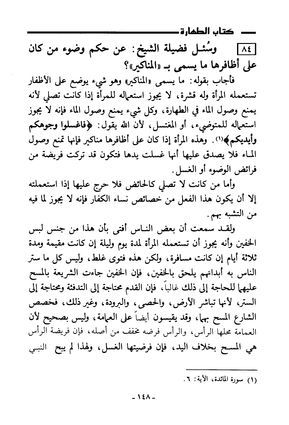 فأجاب بقوله: ما يسمى (المناكير) وهو شيء يوضع على الأظفار تستعمله المرأة وله قشرة، لا يجوز استعماله للمرأة إذا كانت تصلي لأنه يمنع وصول الماء في الطهارة، وكل شيء يمنع وصول الماء فإنه لا يجوز استعماله للمتوضئ، أو المغتسل، لأن الله يقول: (فَاغْسِلُوا وُجُوهَكُمْ وَأَيْدِيَكُمْ) (1) . وهذه المرأة إذا كان على أظافرها مناكير فإنها تمنع وصول الماء فلا يصدق عليها أنها غسلت يدها فتكون قد تركت فريضة من فرائض الوضوء أو الغسل.