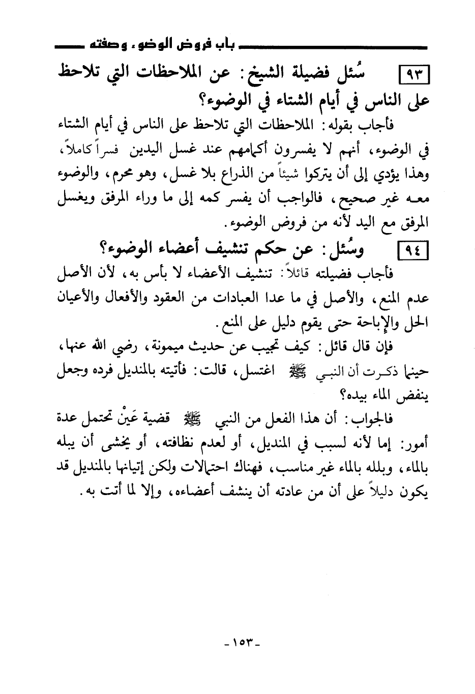 93) سُئل فضيلة الشيخ: عن الملاحظات التي تلاحظ على الناس في أيام الشتاء في الوضوء؟