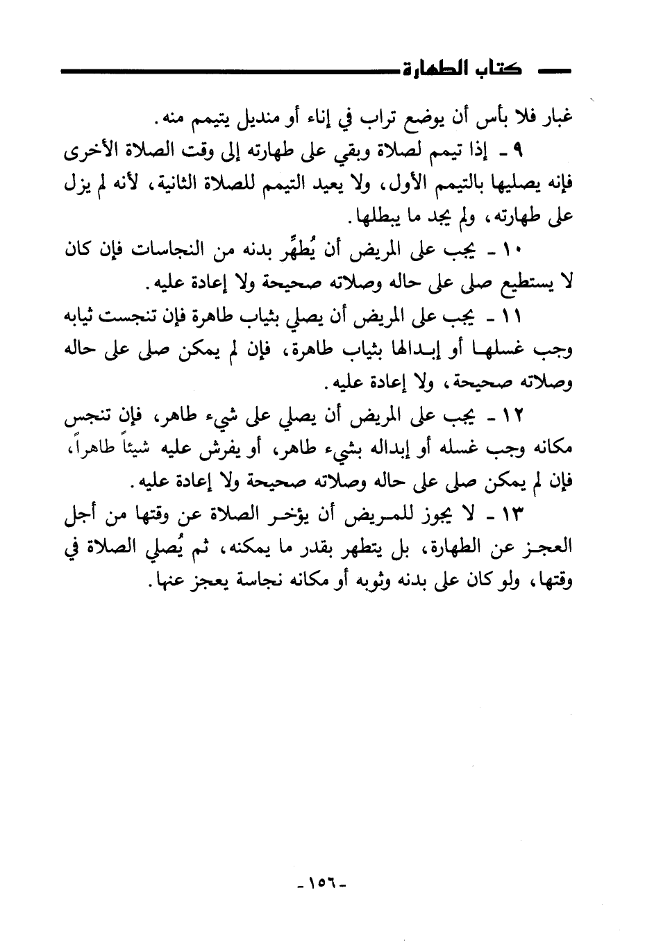 13- لا يجوز للمريض أن يؤخر الصلاة عن وقتها من أجل العجز عن الطهارة، بل يتطهر بقدر ما يمكنه من ثم يُصلي الصلاة في وقتها، ولو كان على بدنه وثوبه أو مكانه نجاسة يعجز عنها.