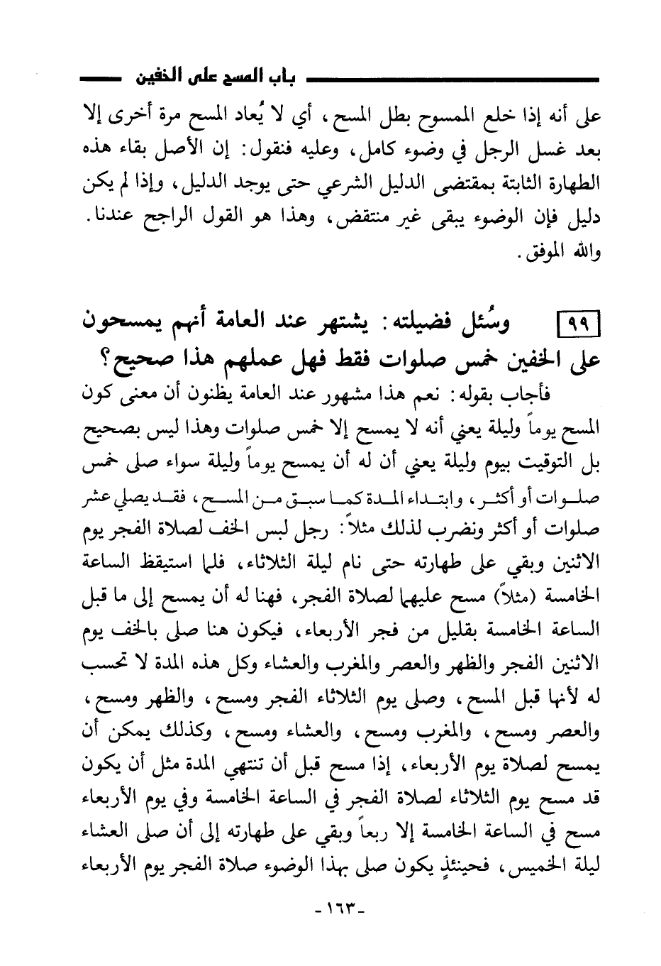 99) وسُئل فضيلته:يشتهر عند العامة أنهم يمسحون على الخفين خمس صلوات فقط فهل عملهم هذا صحيح؟