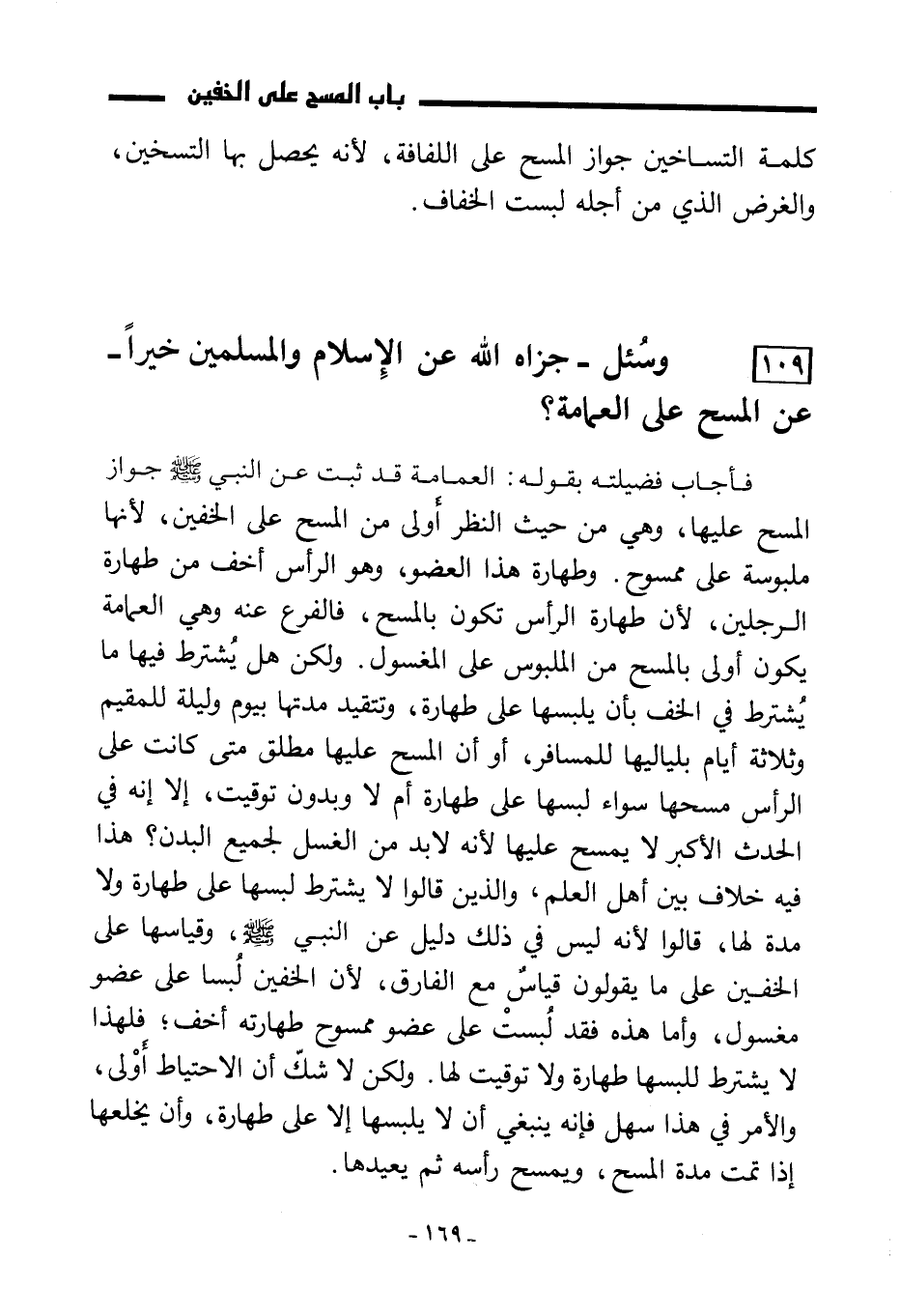 109) وسُئل - جزاه الله عن الإسلام والمسلمين خيراً - عن المسح على العمامة؟