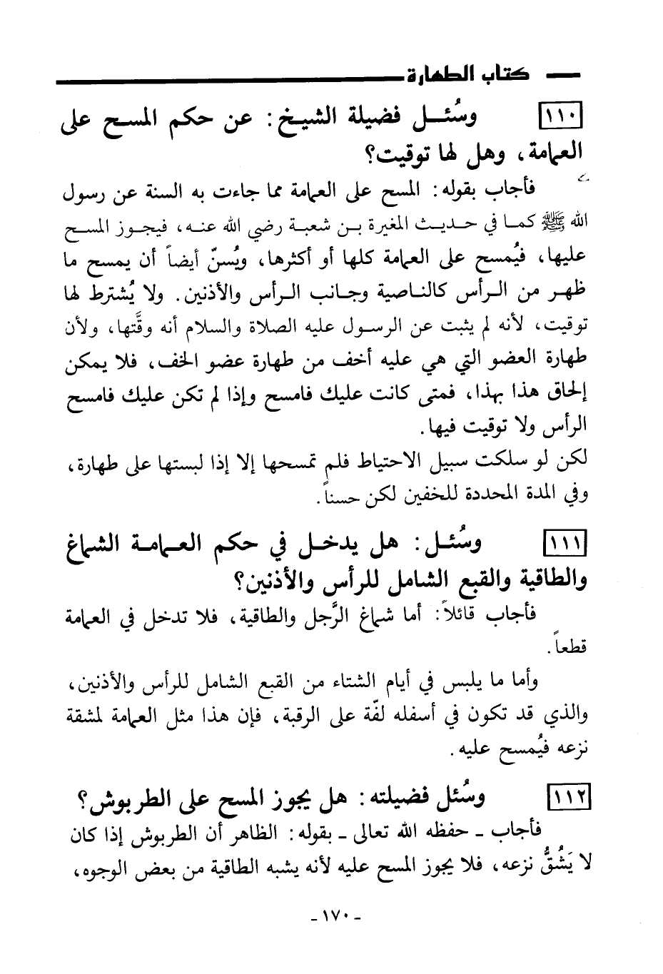 110) وسُئل فضيلة الشيخ: عن حكم المسح على العمامة، وهل لها توقيت؟